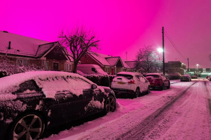 Cerul din regiunea West Midlands din Birmingham a căpătat joi seară o nuanță spectaculoasă de roz, pe fondul ninsorilor abundente provocate de furtuna Goretti.