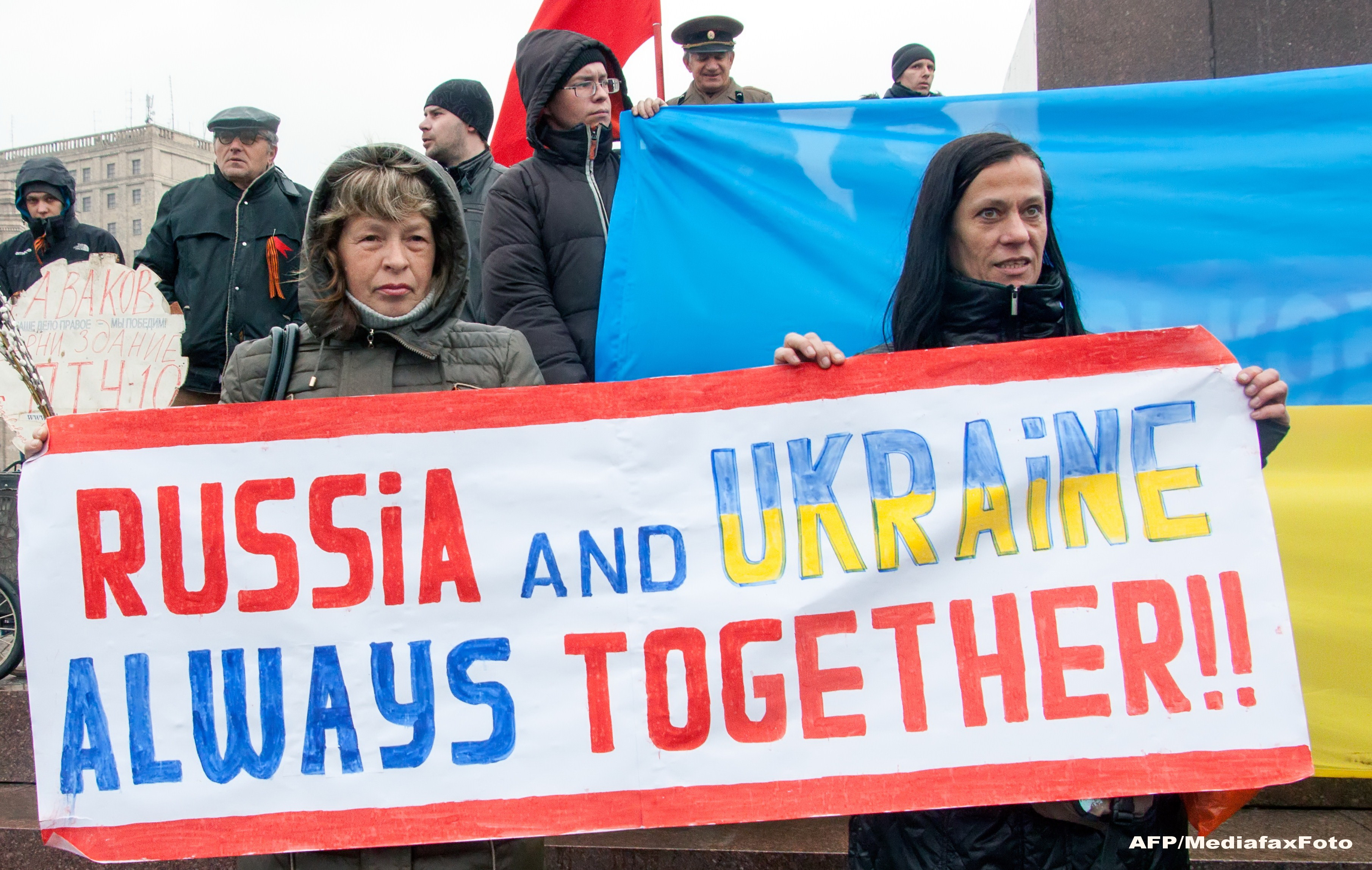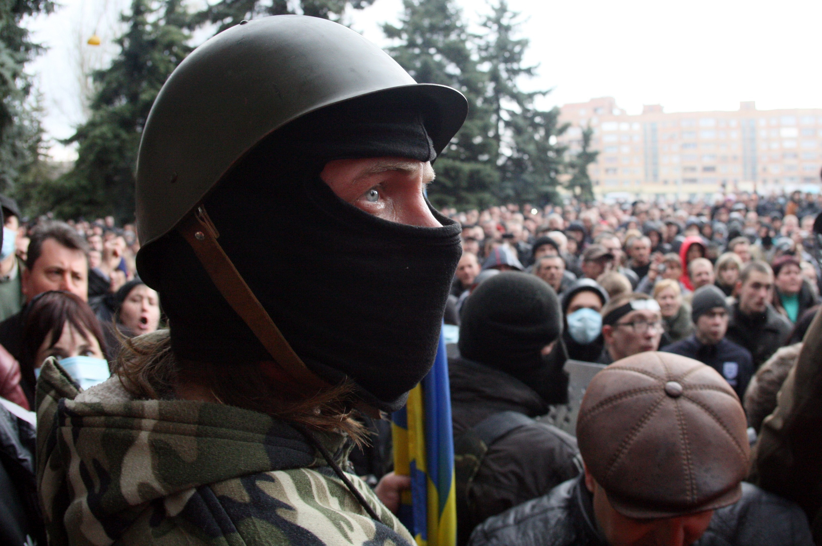 Acesti indivizi armati sunt sustinuti in strada de civili rusofili, care cer zgomotos unirea cu Rusia. In frig si ploaie, barbati si femei de toate varstele formeaza cordoane de aparare in fata cladirilor ocupate, pe care sustin ca le vor apara de o ofensiva a fortelor de securitate ucrainene.