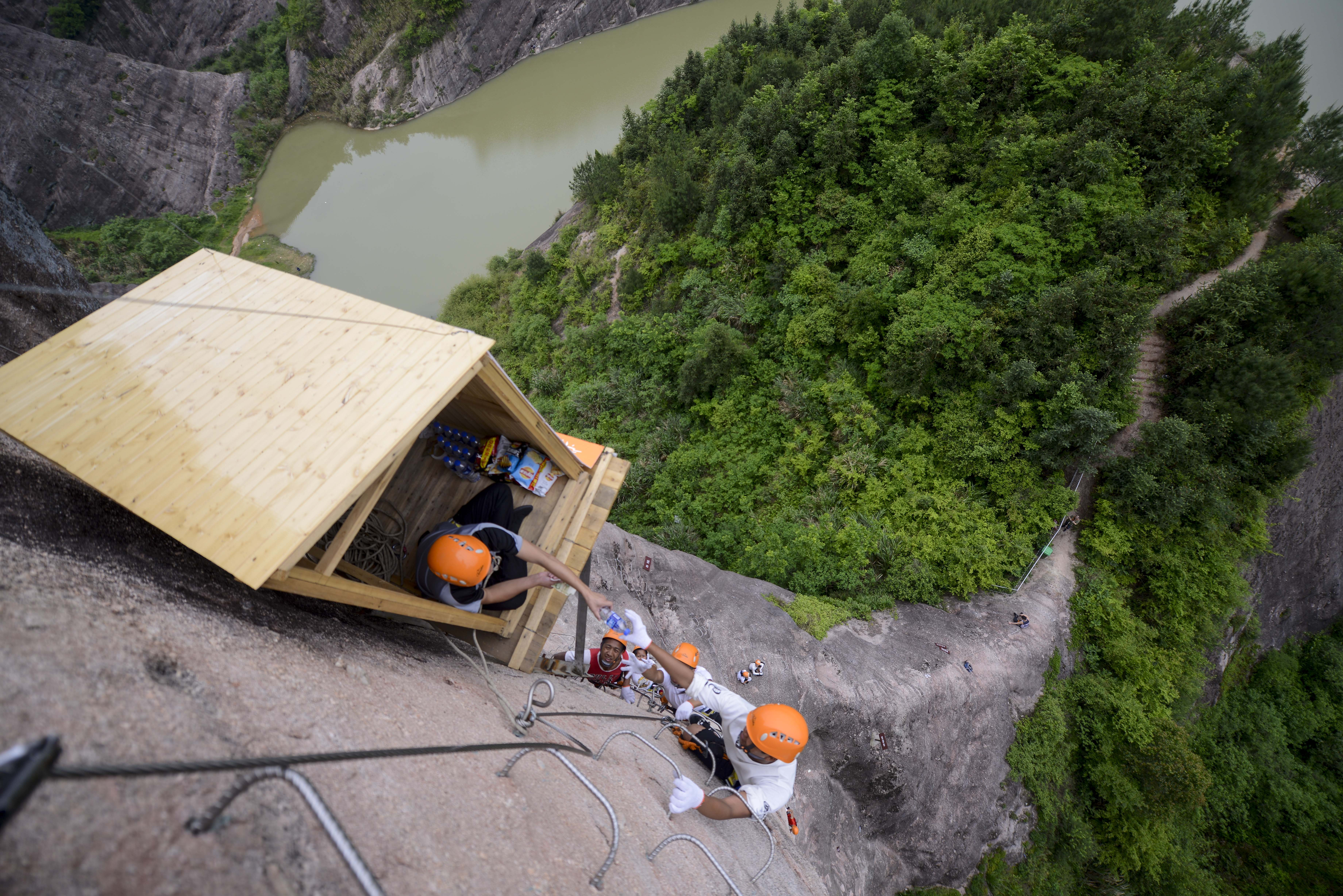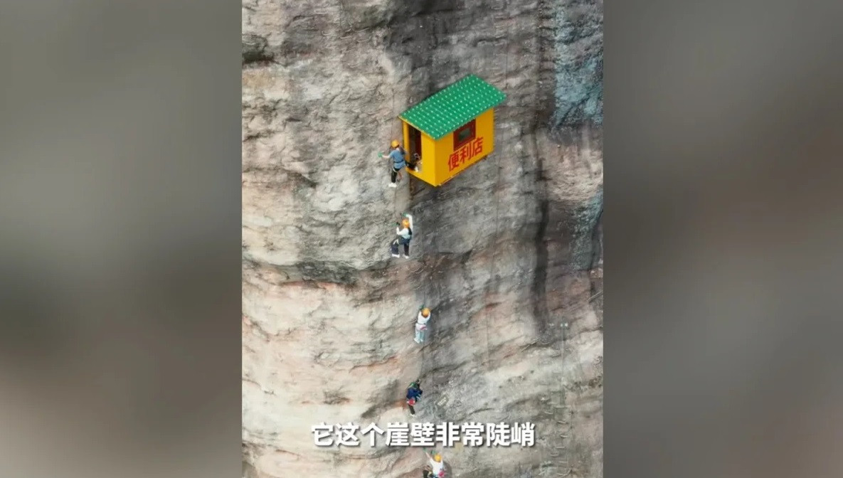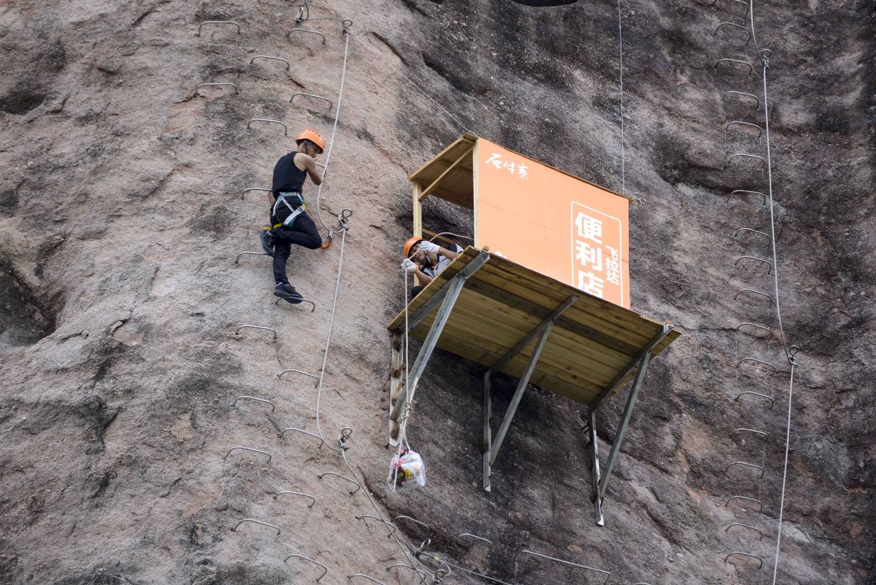 Amplasat la o înălțime uriașă, de 120 de metri deasupra solului, magazinul de doi metri pătrați îi aprovizionează pe alpiniști cu băuturi și răcoritoare, în zona pitorească Shiniuzhai din provincia chineză Hunan, potrivit unui raport recent al ziarului de stat de limbă engleză China Daily, scrie CNN.
