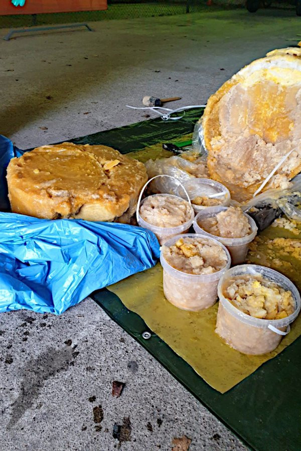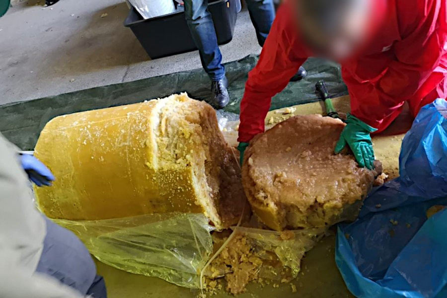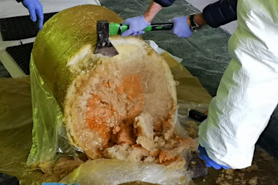 Fotografii şi imagini video postate pe site-ul poliţiei de frontieră arată oficiali în echipament de protecţie deschizând butoaie şi spărgând cu topoare blocurile de ananas congelat în care se aflau drogurile.
