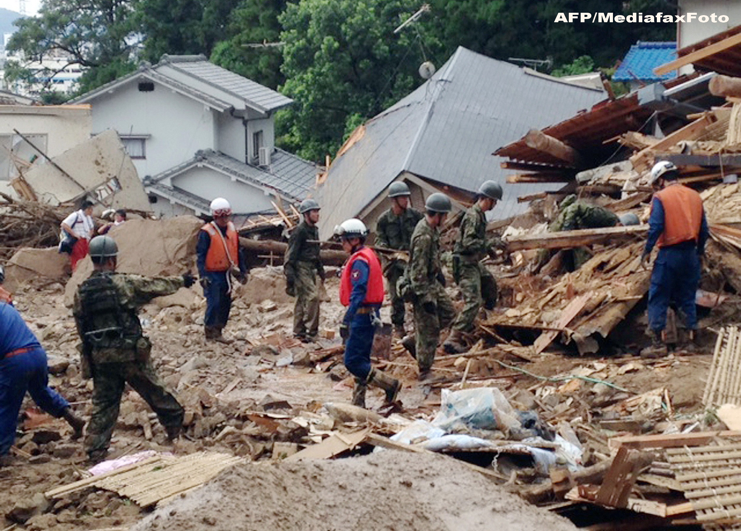 "Sunt ploi inedite si un dezastru de mare amploare. Exista in plus alte riscuri de precipitatii", a declarat in fata presei premierul Shinzo Abe, care si-a intrerupt vacanta. "Am ordonat consolidarea ajutoarelor prin trimiterea mai multor sute de militari din cadrul fortelor de autoaparare" pe teren, a adaugat el.
