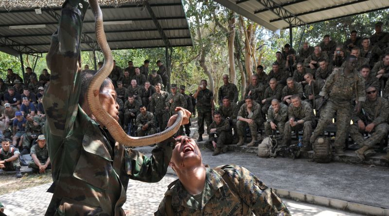 Exercitiul pe care unii dintre cei care militeaza pentru drepturile animalelor il considera infiorator se numeste "Cobra Gold". Lista ciudatului meniu mai include soparle si broaste, asa ca cei care stau prost cu stomacul nu au nici cea mai mica sansa sa scape neobservati.