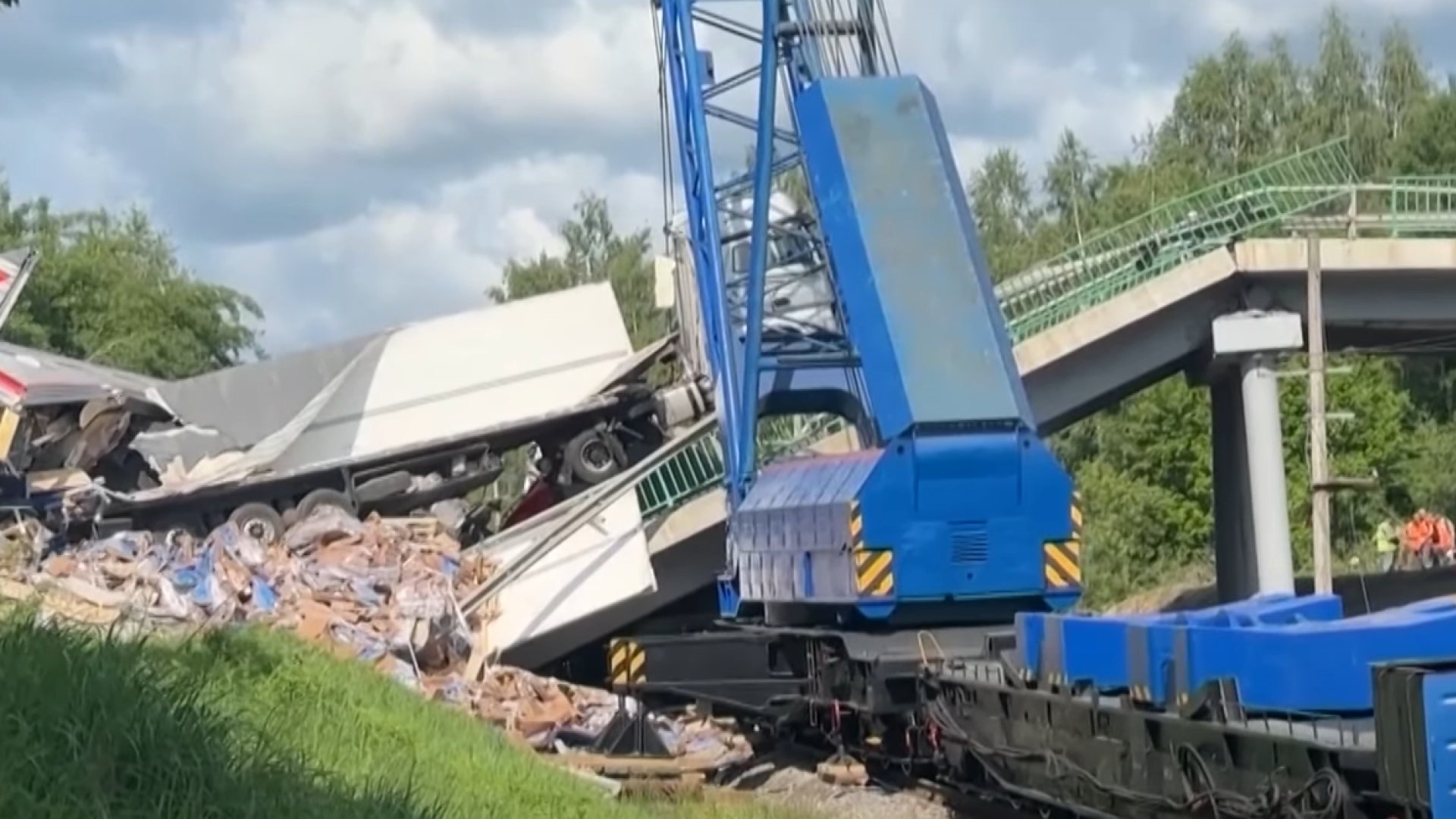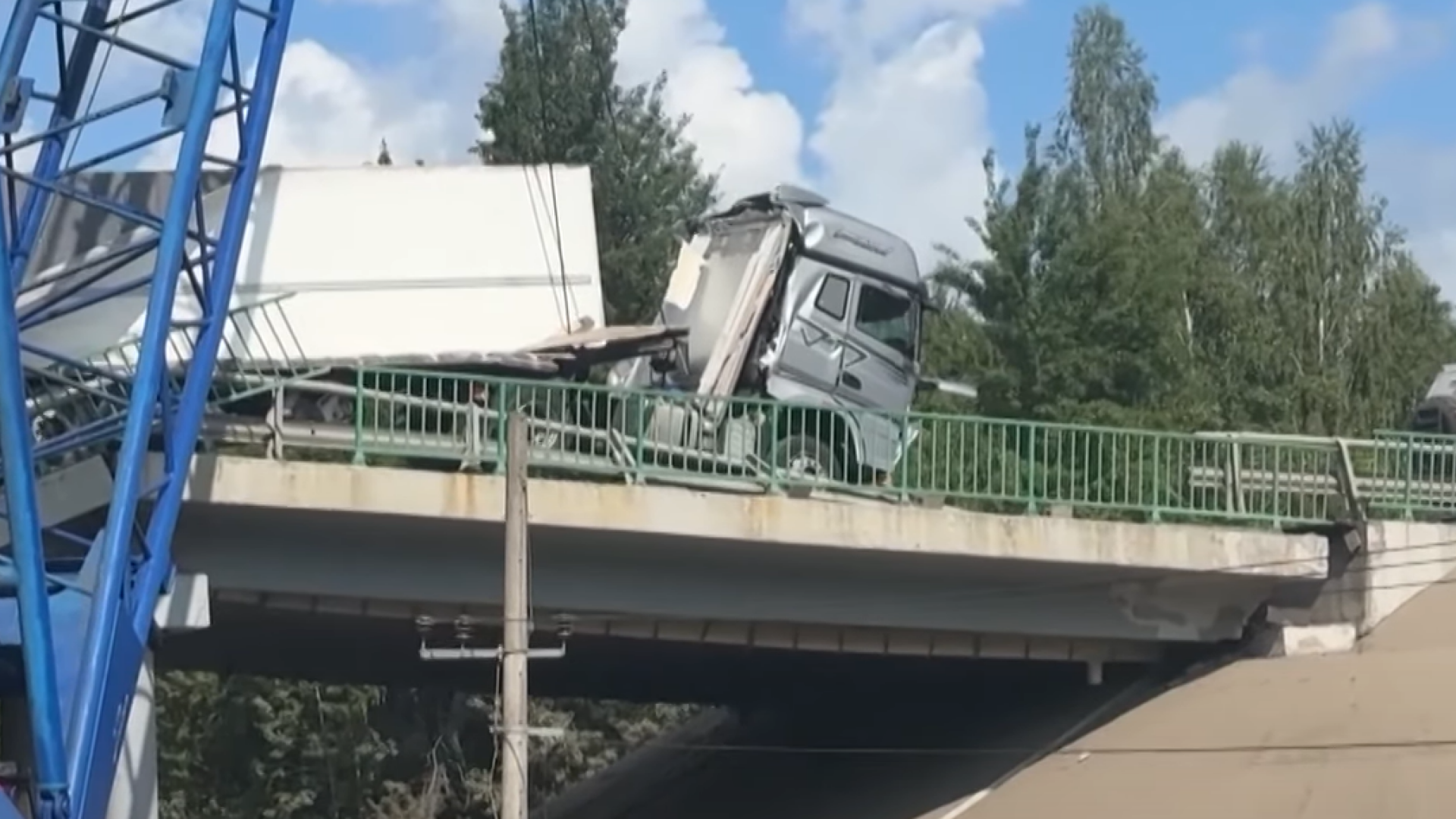 În regiunea Briansk, imagini și videoclipuri de pe rețelele de socializare au arătat o parte a unui tren de pasageri strivit sub un pod rutier prăbușit.