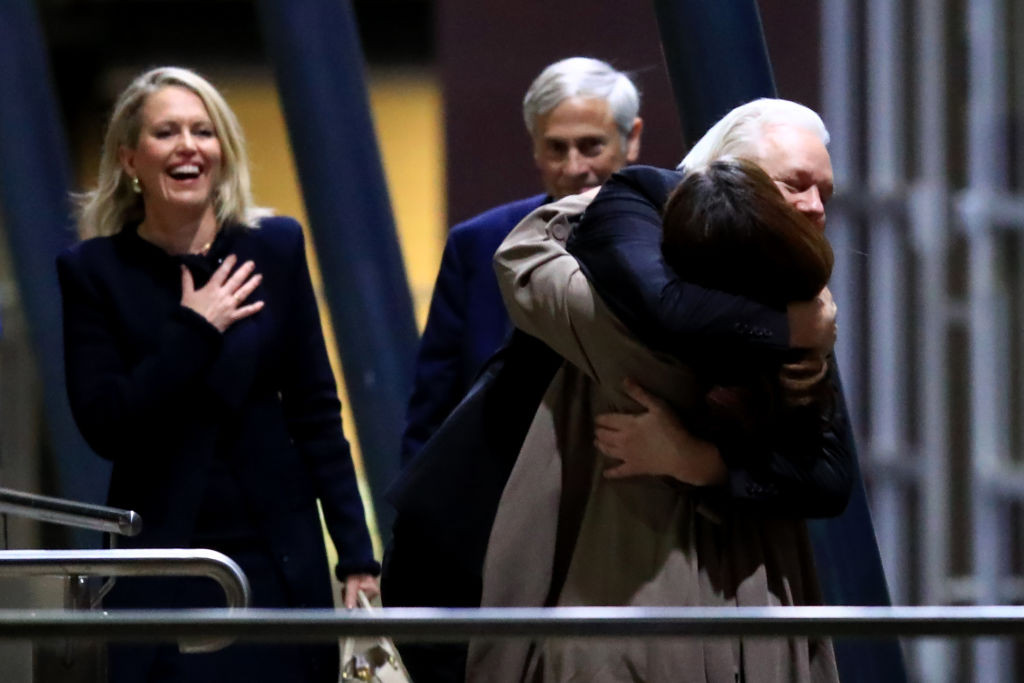 Când s-a apropiat de terminal, soția sa, Stella, a apărut cu un zâmbet larg pe față. Assange a strâns-o în brațe, ridicând-o de la podea înainte ca cei doi să se sărute.