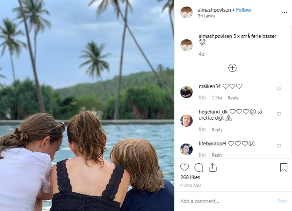 Cu trei zile înainte de atacurile teroriste, Alma Povlsen a publicat pe contul de Instagram o fotografie în care apar frații ei: Astrid, Agnes și Alfred pe care i-a numit în mesajul alăturat pozei ”3 ursuleți”. Fotografia fost realizată la o piscină, înconjurată de palmieri în Sri Lanka. Miliardarul a confirmat moartea a trei dintre copii, dar numele celor ucişi în atentate nu au fost făcute publice, relatează Mirror.