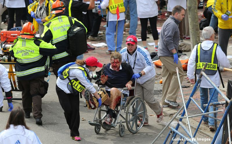 Suflul exploziei a spart geamurile si a imprastiat bucati de moloz peste multimea de pe trotuar. Medicii aflati la fata locului pentru a acorda asistenta atletilor au fost primii care au venit in ajutorul ranitilor. In scurt timp, la fata locului au ajuns zeci de ambulante.