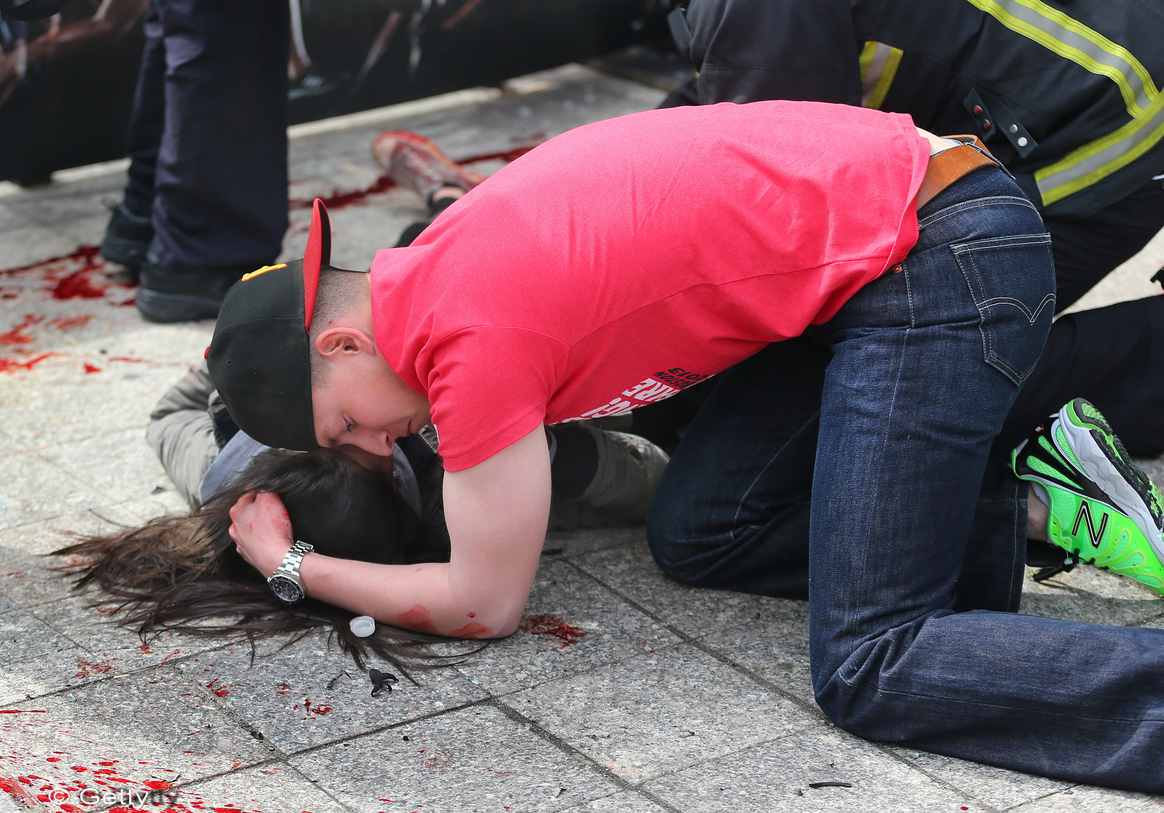 "Aveam locuri in zona VIP, ne uitam de peste drum, am vazut prima explozie, si cum oamenii, scuzati-ma...iar mai apoi alta explozie in josul strazii. Ne-a fost foarte teama ca o alta va exploda in zona unde ne aflam noi." - povesteste un martor al tragediei.