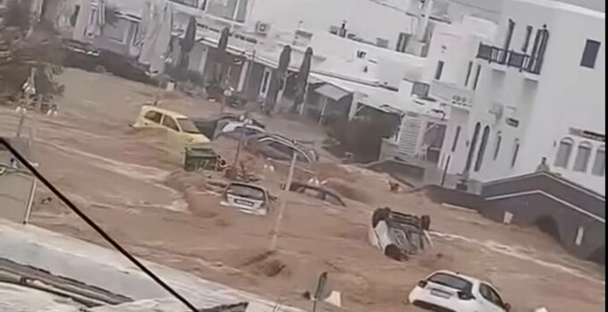 Pe insula vecină Mykonos, unde inundațiile au fost mai puțin intense, autoritățile au folosit excavatoare pentru a degaja drumurile, permițând apei să curgă pe lângă restaurantele și cafenelele de pe malul mării.