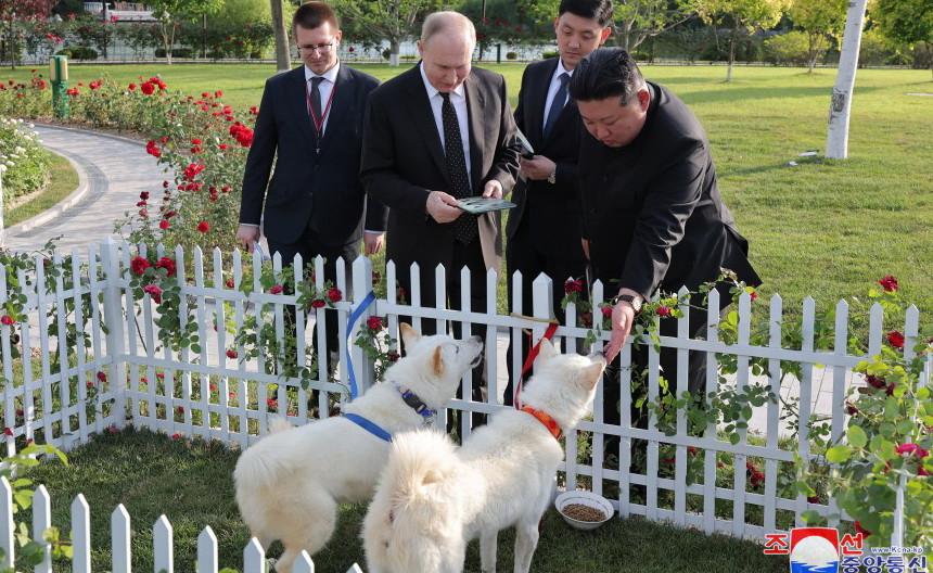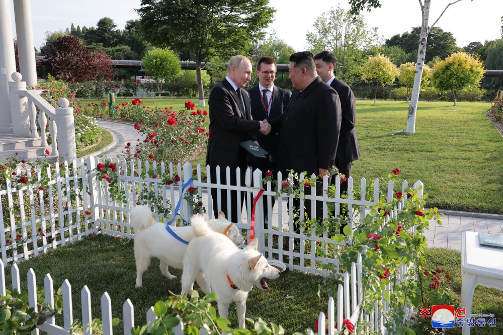 Kim Jong Un i-a oferit lui Putin o pereche de Phungsan, câinele național al RPDC, drept cadou în grădina Casei de oaspeți de stat Kumsusan.