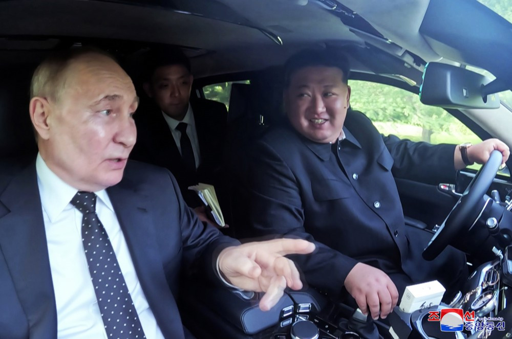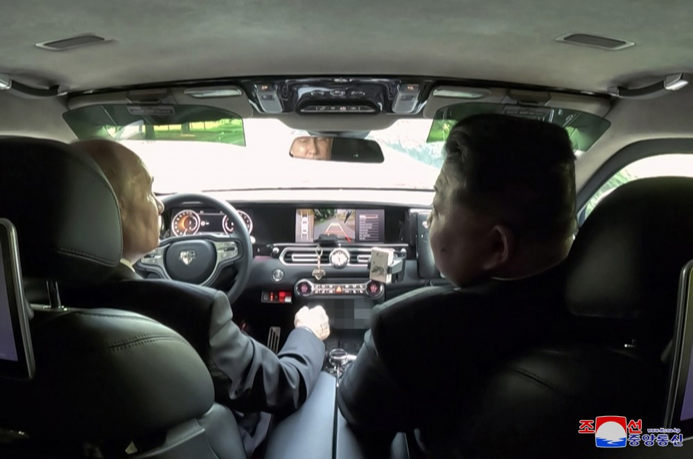 Ocupând pe rând locul șoferului din mașina oferită cadou lui Kim Jong Un de către Putin, liderii de vârf ai celor două țări s-au bucurat de plimbarea cu mașina de-a lungul aleii frumoasei grădini a pensiunii.
