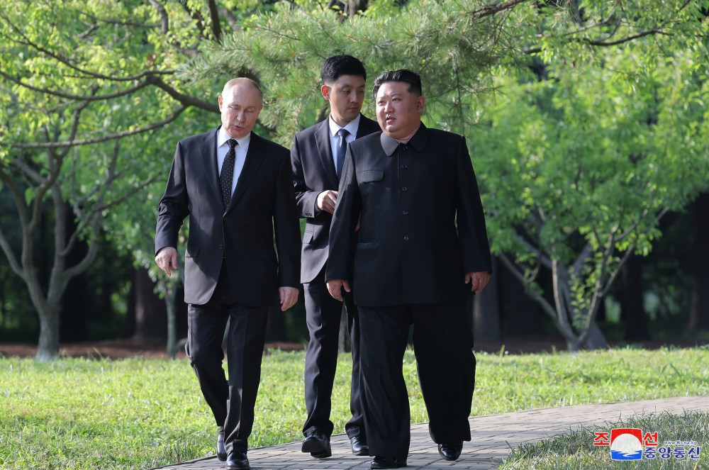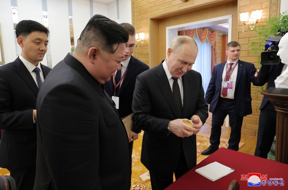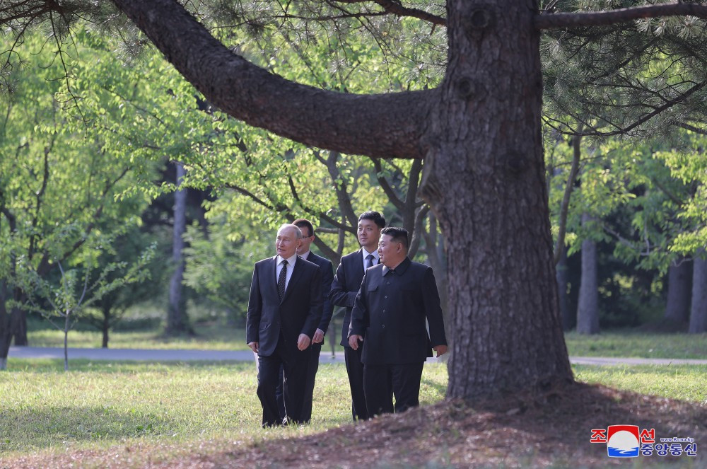 ”Respectatul tovarăș Kim Jong Un a dezvoltat relații cu Vladimir Vladimirovici Putin, președintele Federației Ruse, petrecând timp împreună în grădina Casei de Oaspeți de Stat Kumsusan după ceremonia de semnare a istoricului "Tratat privind Parteneriatul Strategic Cuprinzător între Republica Populară Democrată Coreeană și Federația Rusă".