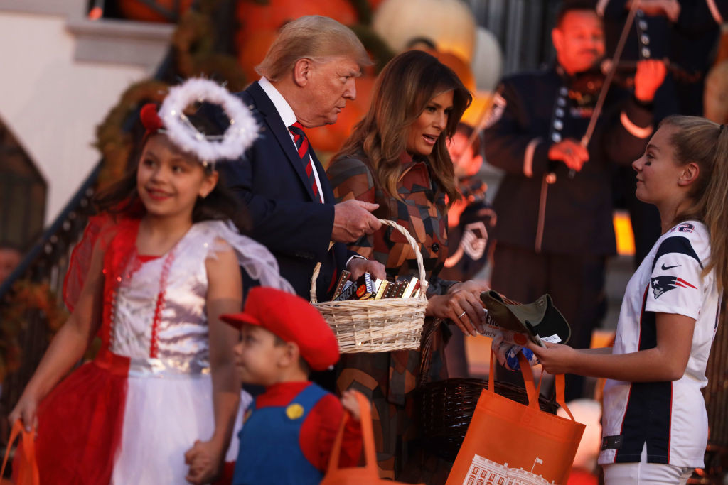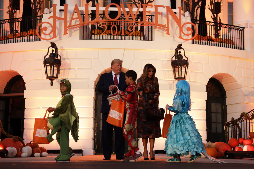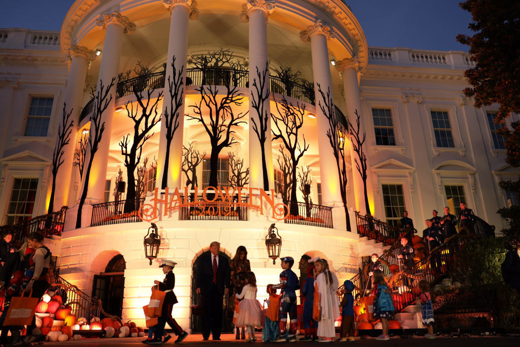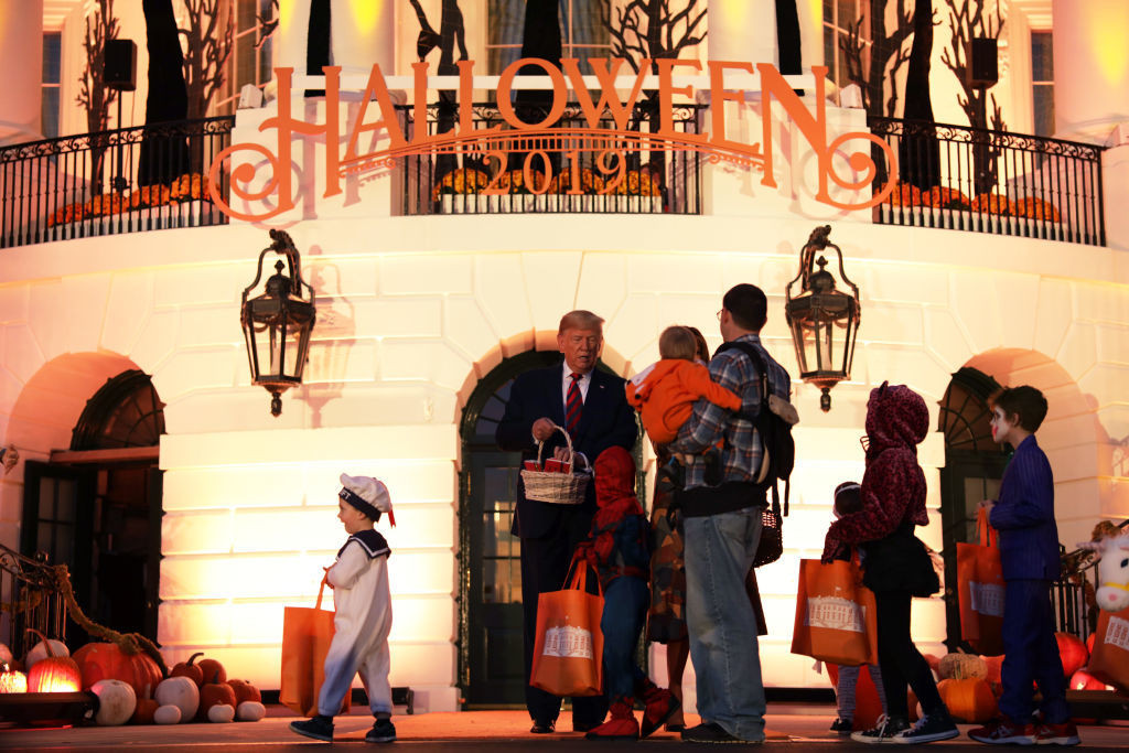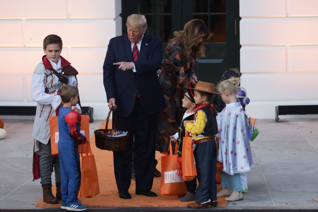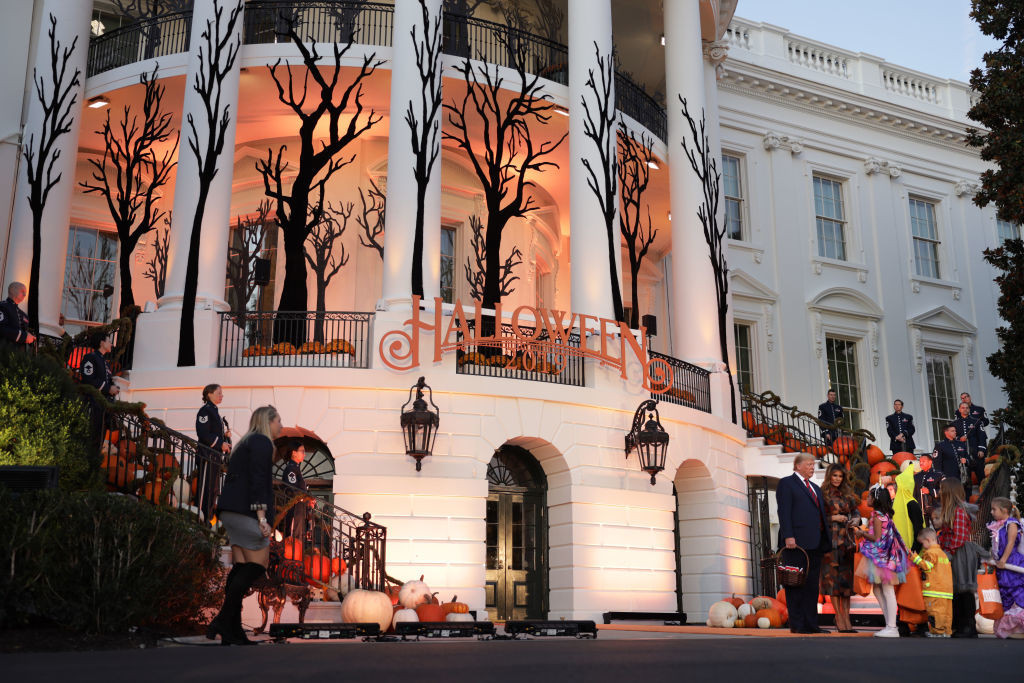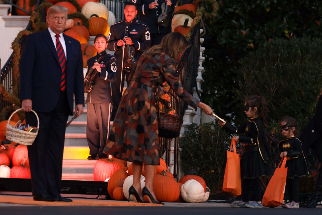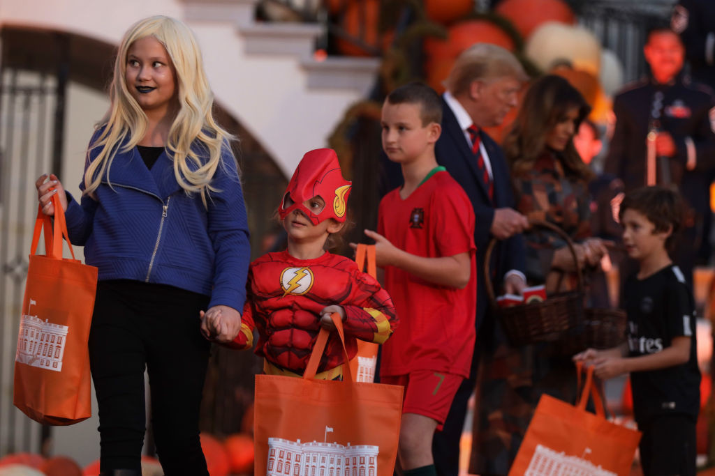 Scările de la Casa Albă au fost decorate cu dovleci și ornamente specifice Halloween-ului, iar Donald și Melania Trump au ieșit pe peluza de la Casa Albă cu coșuri pline de dulciuri, pe care le-au oferit copiilor ce s-au perindat prin fața lor, timp de aproximativ 40 de minute, scrie CNN.
