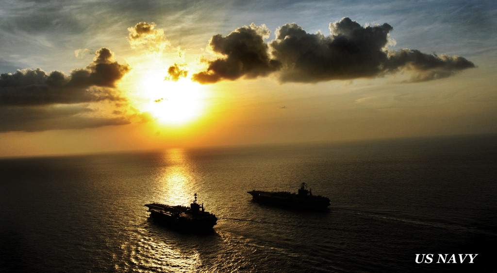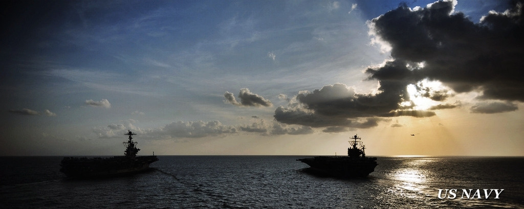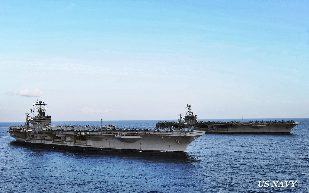 Acestea sunt poortavioanele nucleare USS Abraham Lincoln si USS John C. Stennis, doua dintre cele mai temute arme ale marinei americane. Privelistea anunta necazuri mari pentru intreaga lume.