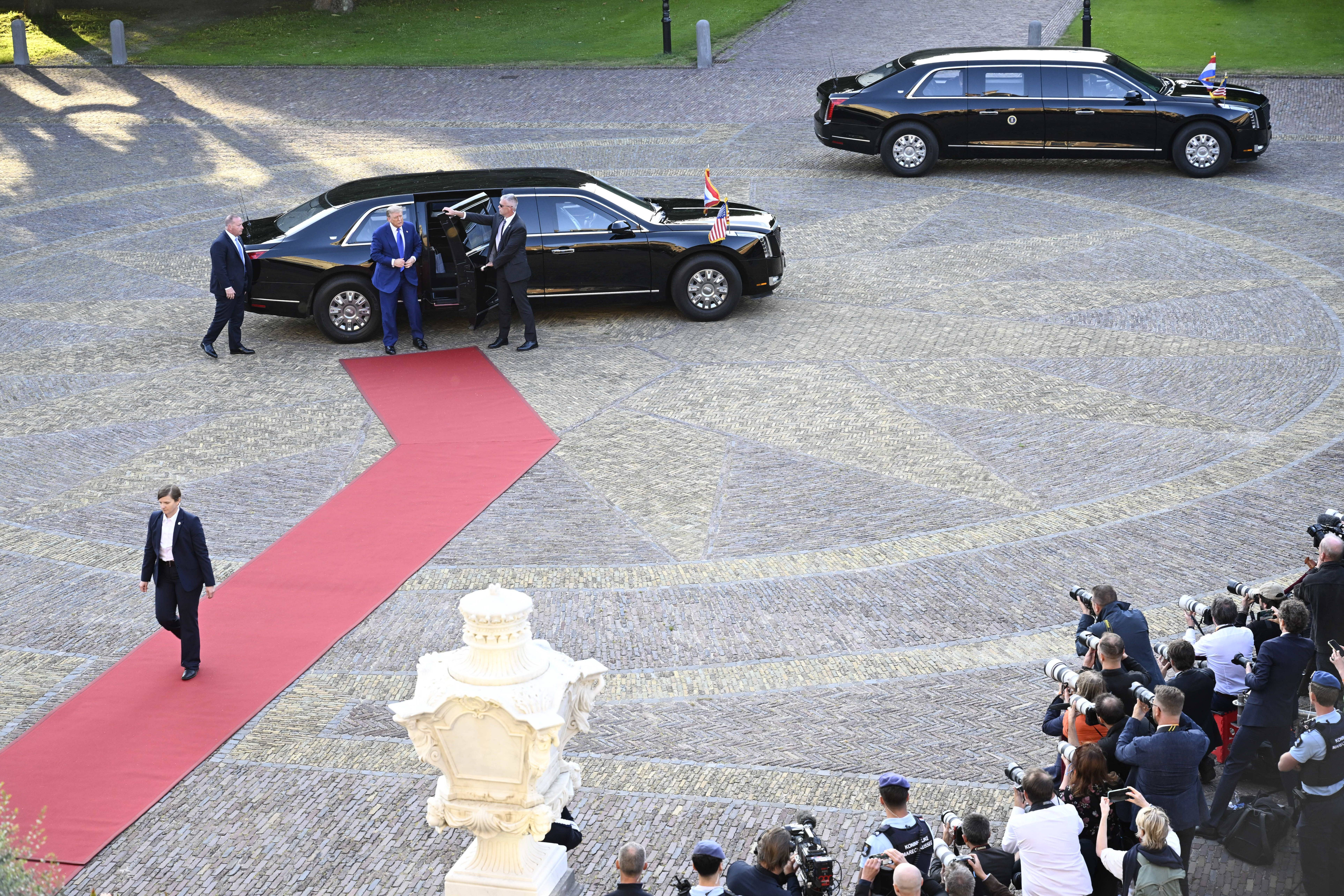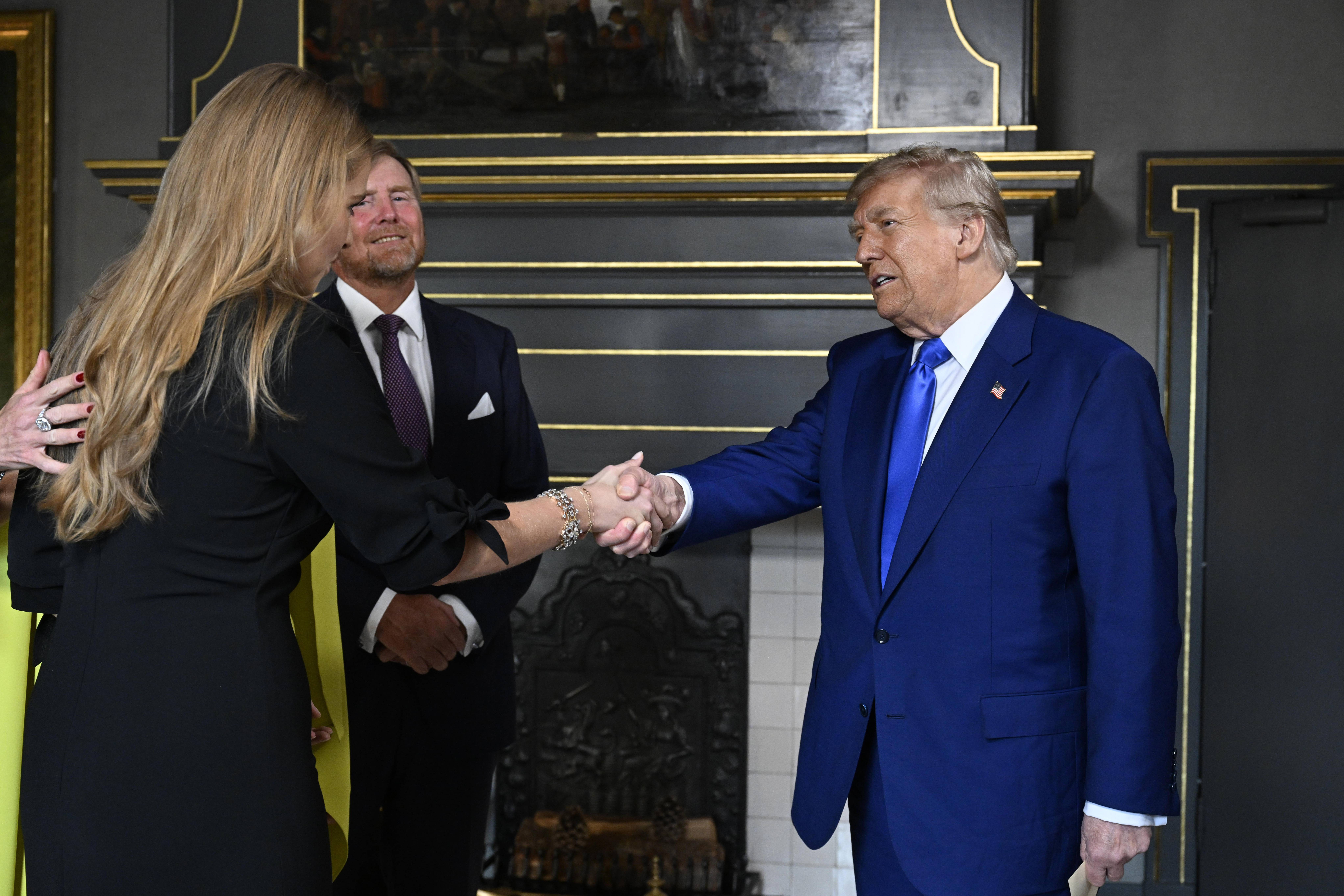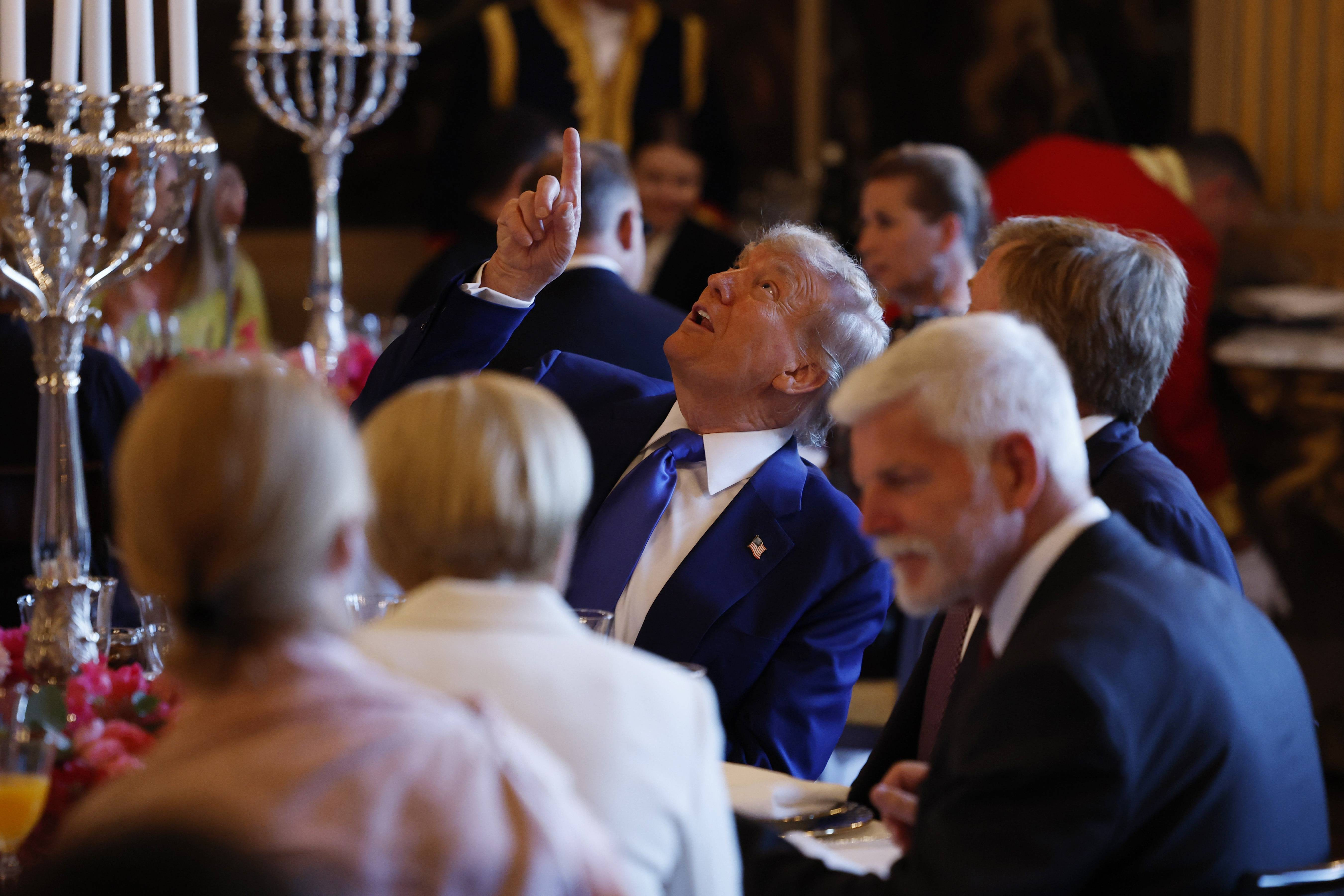 Trump arată uluit cu degetul spre tavanul Oranjezaal