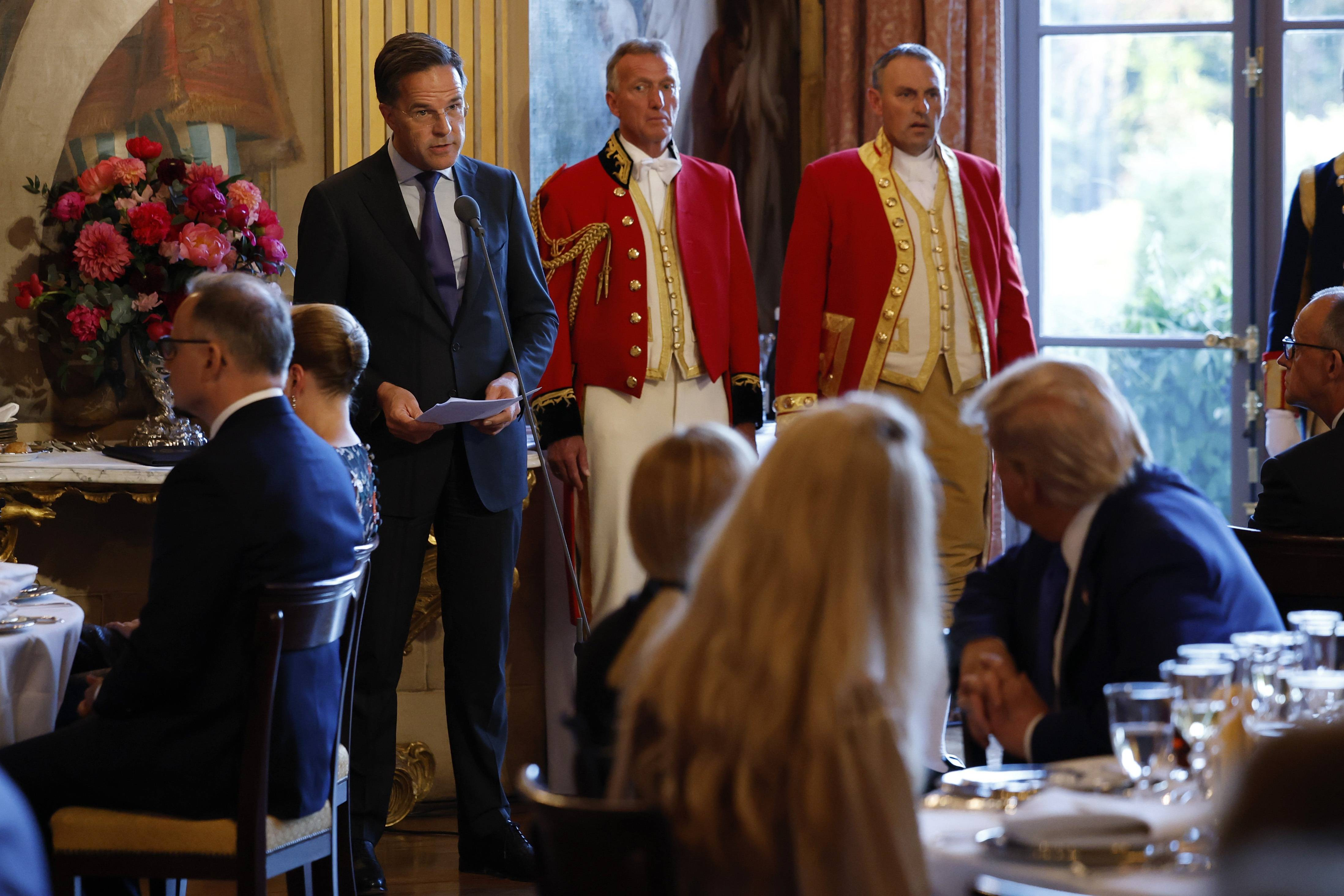 ”Cina de socializare”, așa cum a prezentat-o sobru NATO, a avut loc în Oranjezaal, sala centrală a Palatului Huis ten Bosch, o capodoperă pictată în secolul XVII și una dintre cele mai importante lucrări de artă din istoria olandeză.