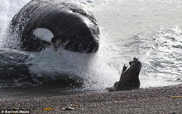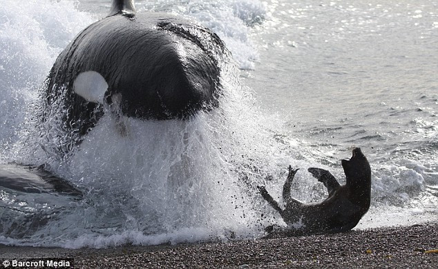 Fotograful Rob Lott a surprins imagini de-a dreptul dramatice pe coasta Pantagoniei, in Argentina. Un pui de foca, urmarit de o balena ucigasa, reuseste sa scape in ultima clipa de atacul uriasului pradator, iesind din apa rece ca gheata.