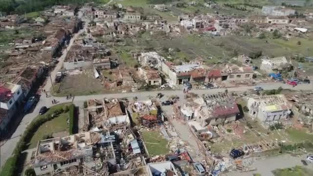 Casele au acoperişurile smulse ori distruse. Maşinile sunt ori răsturnate, ori fărâmate de dărâmături. Peste tot sunt resturi ridicate de tornadă şi copaci dezrădăcinaţi.