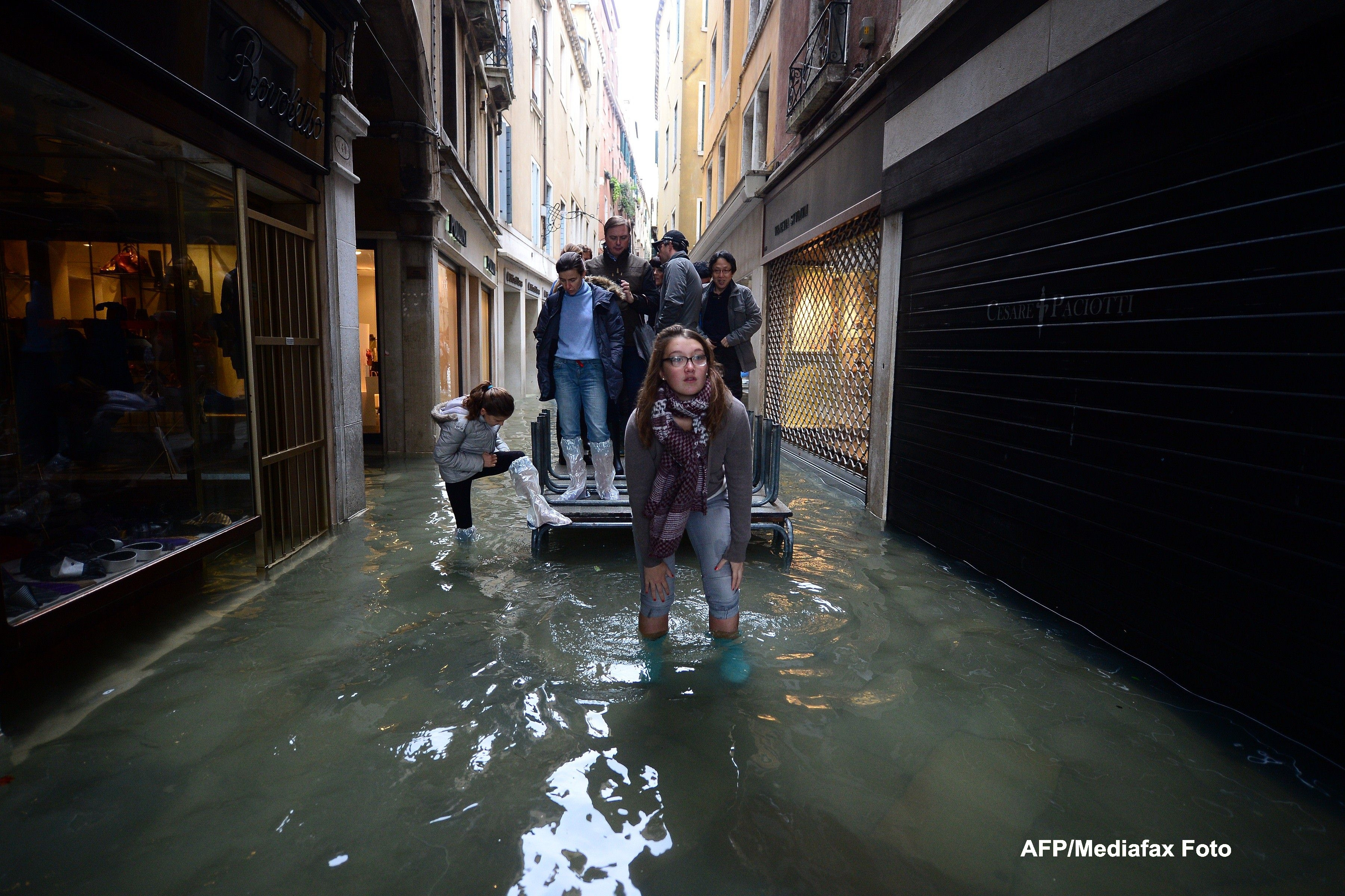 Turistii care s-au incumetat sa iasa la plimbare in piata San Marco au facut rost mai intai de cizme pescaresti, pana peste genunchi. Iar pe terasele din fata celebrelor cafenele venetiene abia se mai zareau spatarele scaunelor, pentru ca mesele erau complet acoperite de apa.