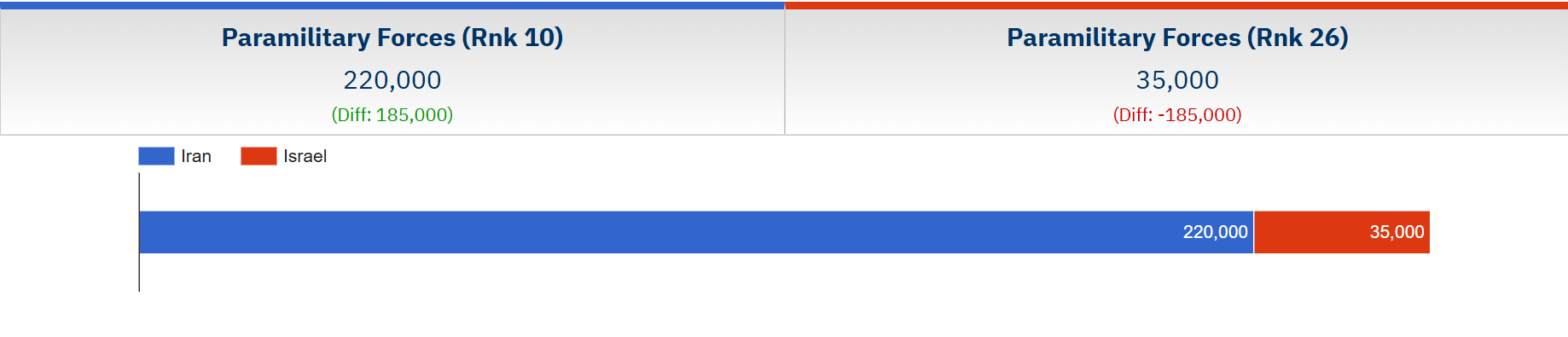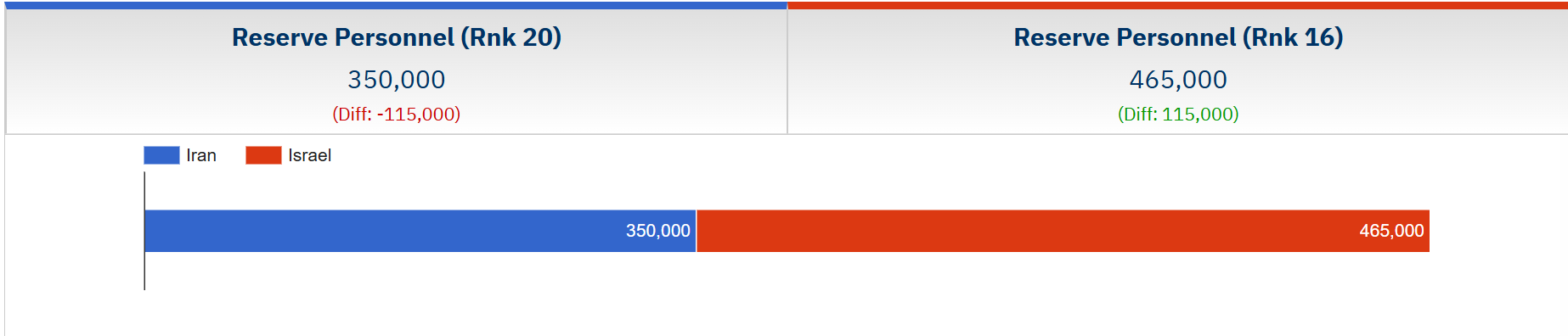 Iranul are o armată de 610.000 de oameni, în timp ce armata Israelului numără 170.000 de persoane. Acestora li se adaugă 220.000 de forțe paramilitare iraniene vs 35.000 israeliene. În plus, Iranul mai are 350.000 de rezerviști vs 465.000 ai Israelului.