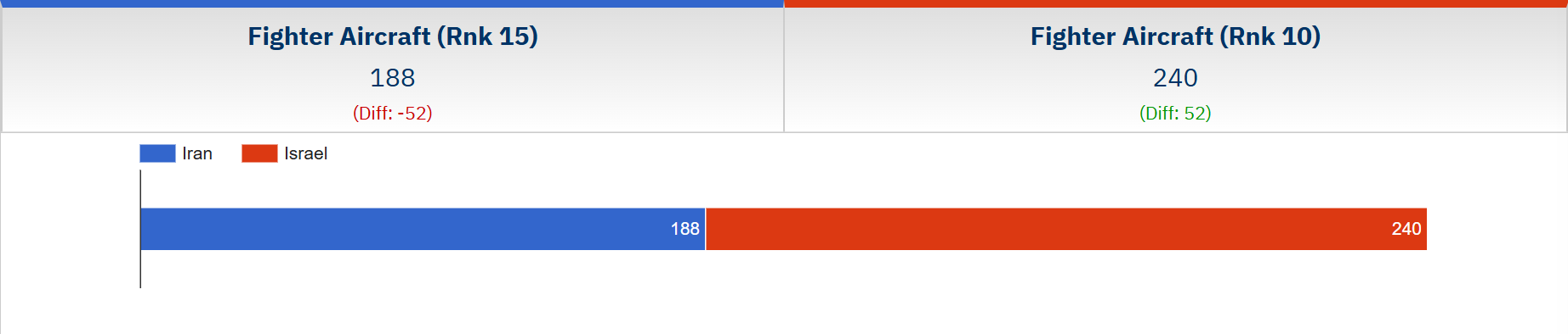 Un război dintre Israel și Iran se bazează aproape exclusiv pe lovituri aeriene. Aici, Iranul dispune de 551 de avioane (locul 20 în lume), față de cele 611 ale Israelului (locul 16). Iranul deține 188 de avioane de luptă (locul 15 global), Israel 240 (locul 10 în lume).