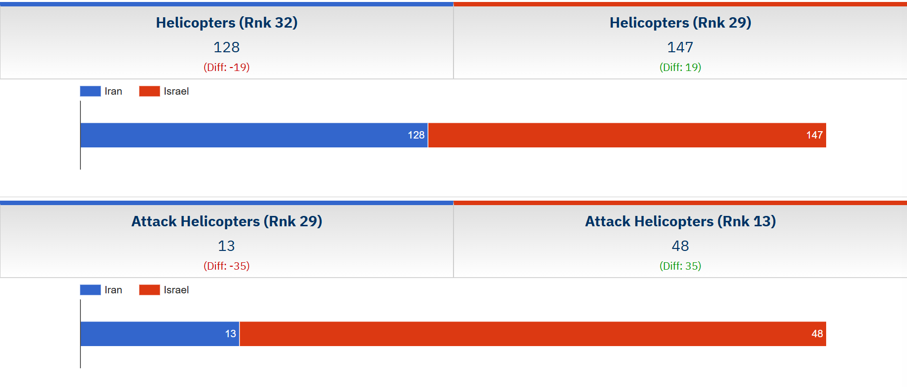 Iran are 128 de elicoptere (locul 32 în lume), Israel 147 (locul 29), din care 13 de atac Iranul (locul 29) și 48 Israelul (locul 13).