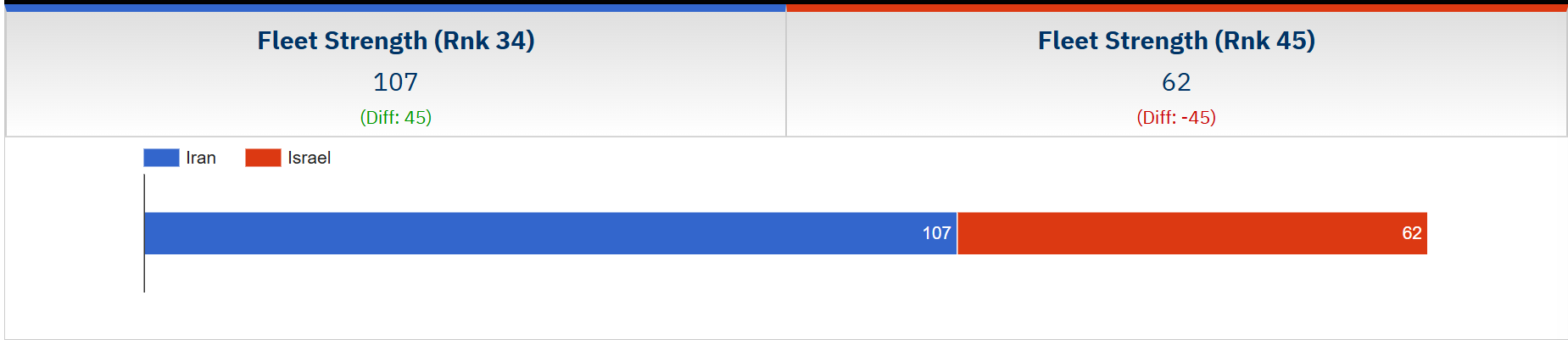 Pe mare, Iranul are 107 nave de război (locul 34 în lume), în timp ce Israel deține 62 (locul 45), în timp la submarine avem un raport de 25 (locul 4) vs 5 (locul 13).
