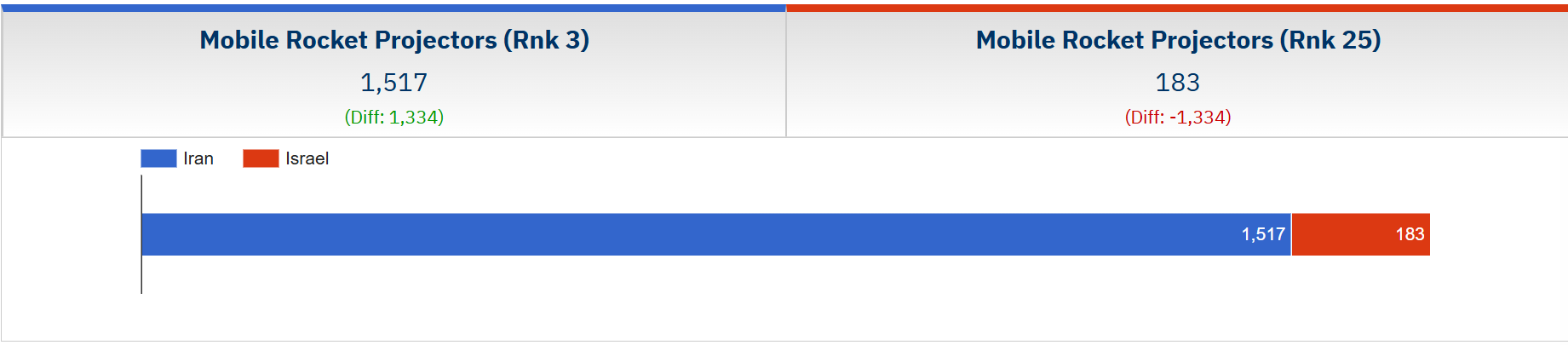 La sol, Iranul deține 1.713 tancuri (locul 10), în timp ce Israel are 1.300 (locul 15); 65.825 vehicule blindate (locul 8 în lume) vs 35.985 (locul 15); 392 unități artilerie autopropulsată (locul 15) vs 352 (locul 18); 2.070 unități artilerie remorcate (loc 5) vs 171 (locul 47); 1.517 lansatoare mobile de rachete (locul 3 în lume) vs 183 (locul 25).