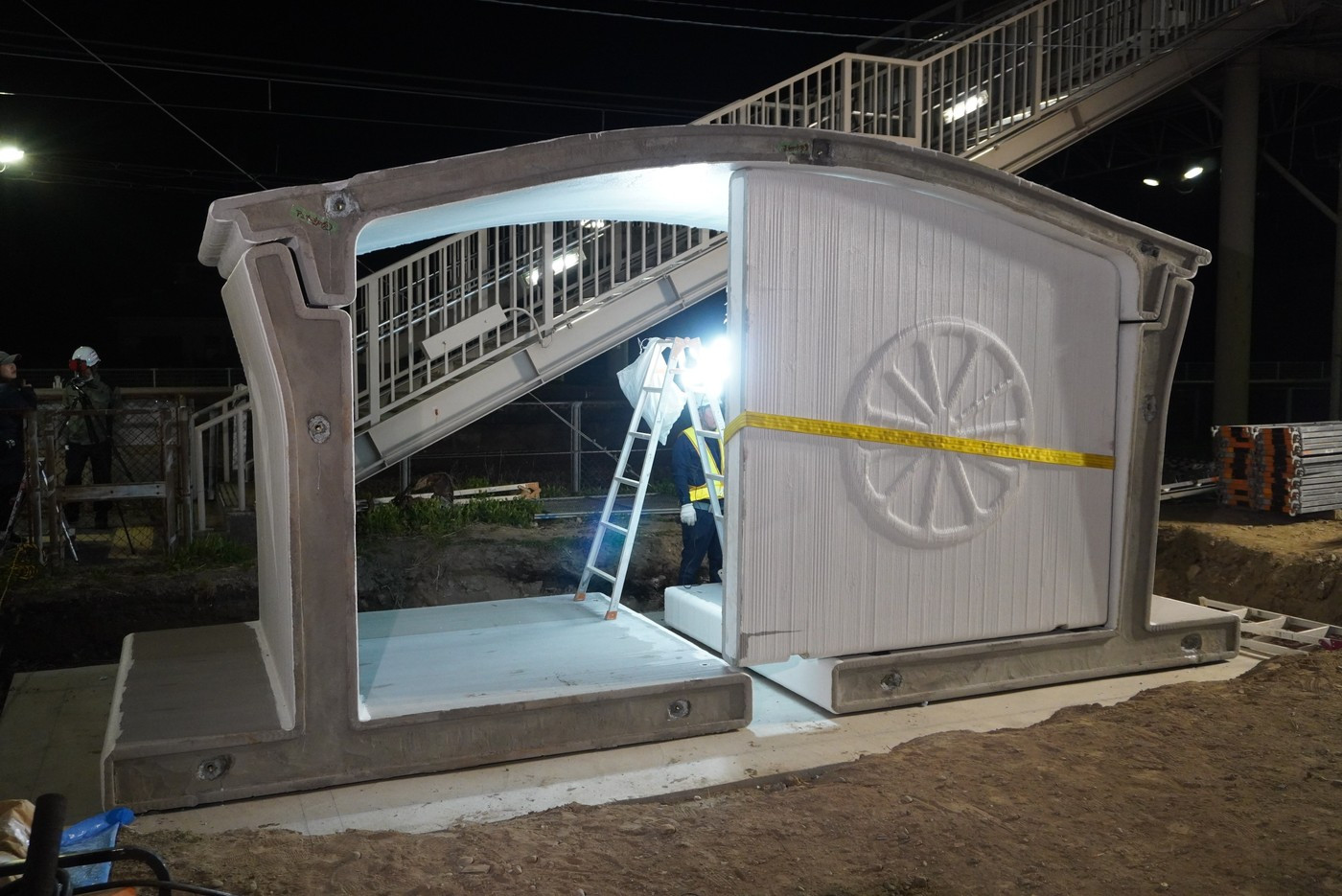 Piesele au fost armate cu oţel şi umplutură din beton armat, apoi asamblate la faţa locului, a declarat JR West într-un comunicat publicat în martie.