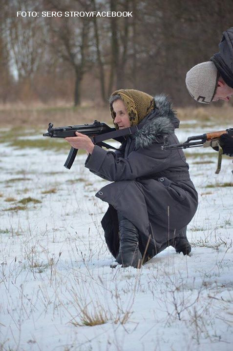 Batrana a aparut pe nepusa masa in timpul unui exercitiu militar destinat civililor organizat in Jdasiv, un oras din vestul Ucrainei, in regiunea Liov. Echipata cu traditionala basma de “babuska” dar si cu un pistol-mitraliera Heckler & Koch MP5, femeia a participat la antrenamentul militar cu mai mult entuziasm decat multi dintre tinerii prezenti. Katerina Apolinariivna a tras cu arma si a exersat mai multe posturi de tir, in ciuda varstei inaintate.
