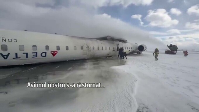 Accident aviatic neobișnuit, petrecut în Toronto. Toți pasagerii unei aeronave care s-a răsturnat pe pistă la aterizare au supraviețuit. Atenție, urmează scene cu un puternic impact emoțional!