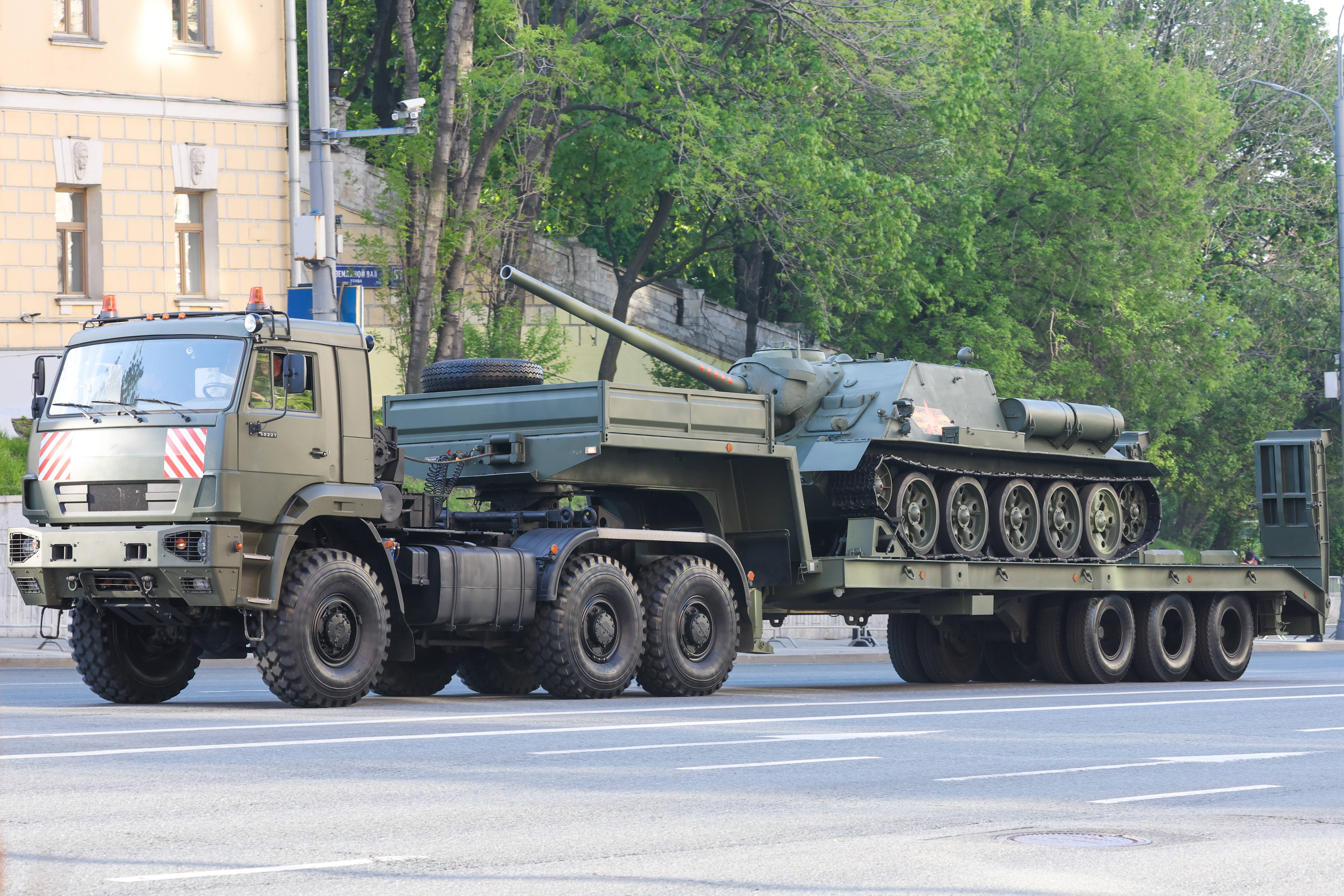 Pe lângă tancurile T-34, în partea istorică a paradei, prin Piaţa Roşie vor trece tunuri de artilerie autopropulsate SU-100, care au fost utilizate şi în timpul celui de-al Doilea Război Mondial.