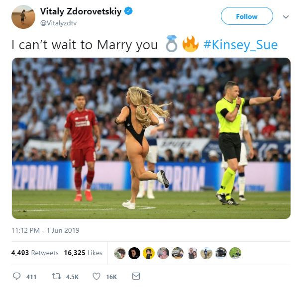 ”Am întrerupt finala Champions League. Viața trebuie trăită, fă lucruri nebune pe care ți le vei aminti mereu” a fost reacția lui Kinsey Wolanski pe Instagram unde a postat și o glumă la adresa lui Harry Winks, de la Tottenham: ”L-am distras prea mult pe numărul 8?”