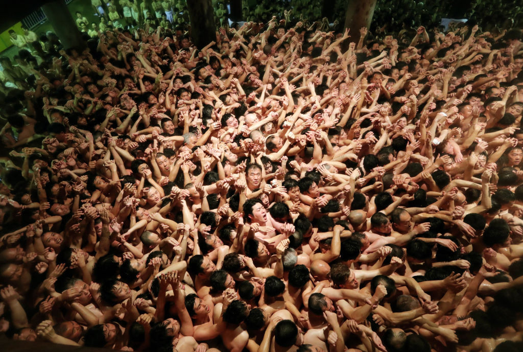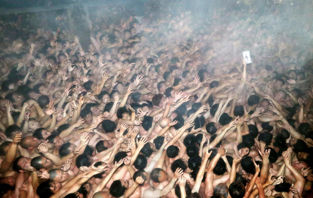 Aproximativ 10.000 de bărbaţi japonezi acoperiţi doar cu bucăţi de pânză au înfruntat temperaturile scăzute din acest weekend şi s-au adunat într-un templu unde s-au luptat să prindă talismane din lemn aruncate în mulţime, relatează Reuters.