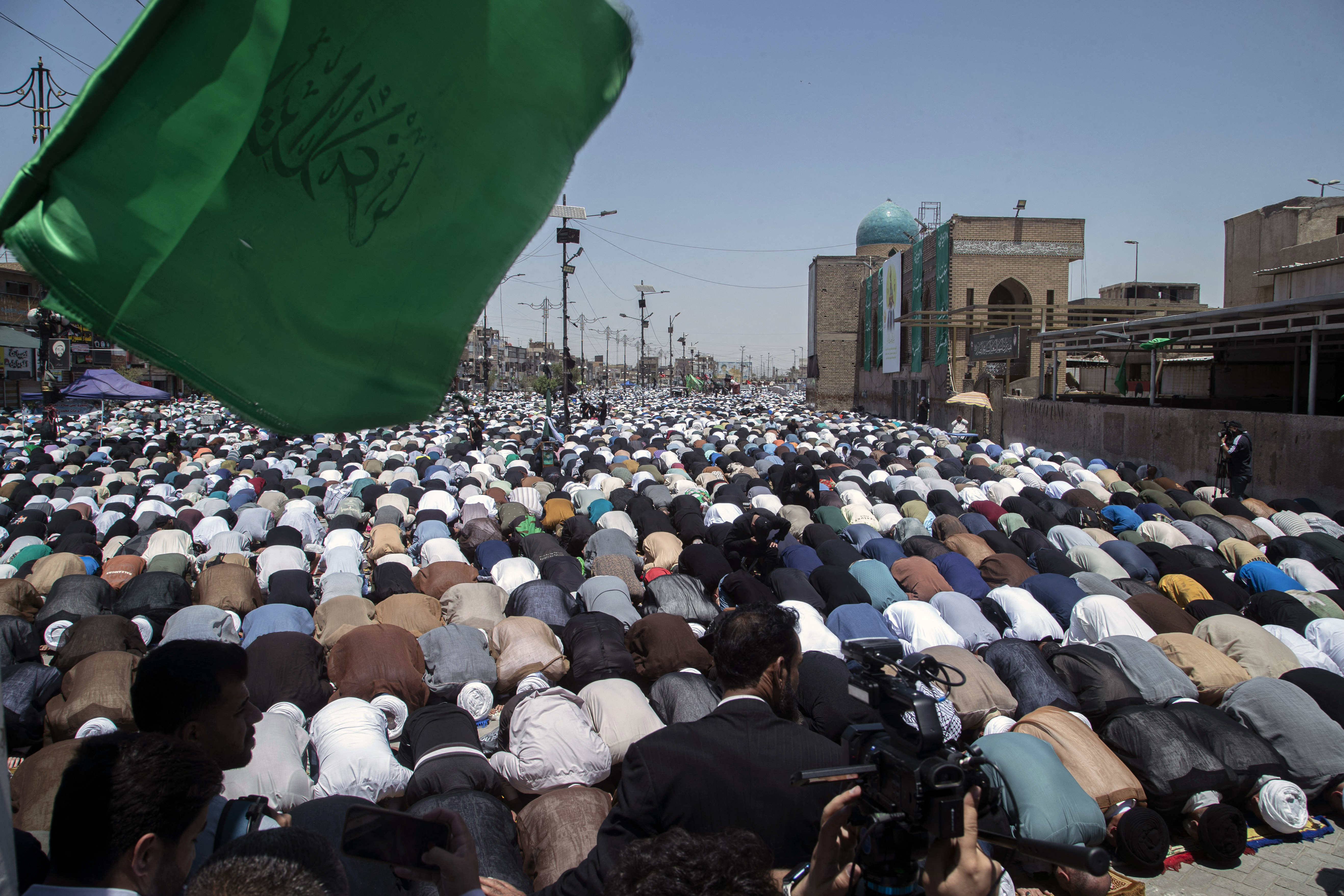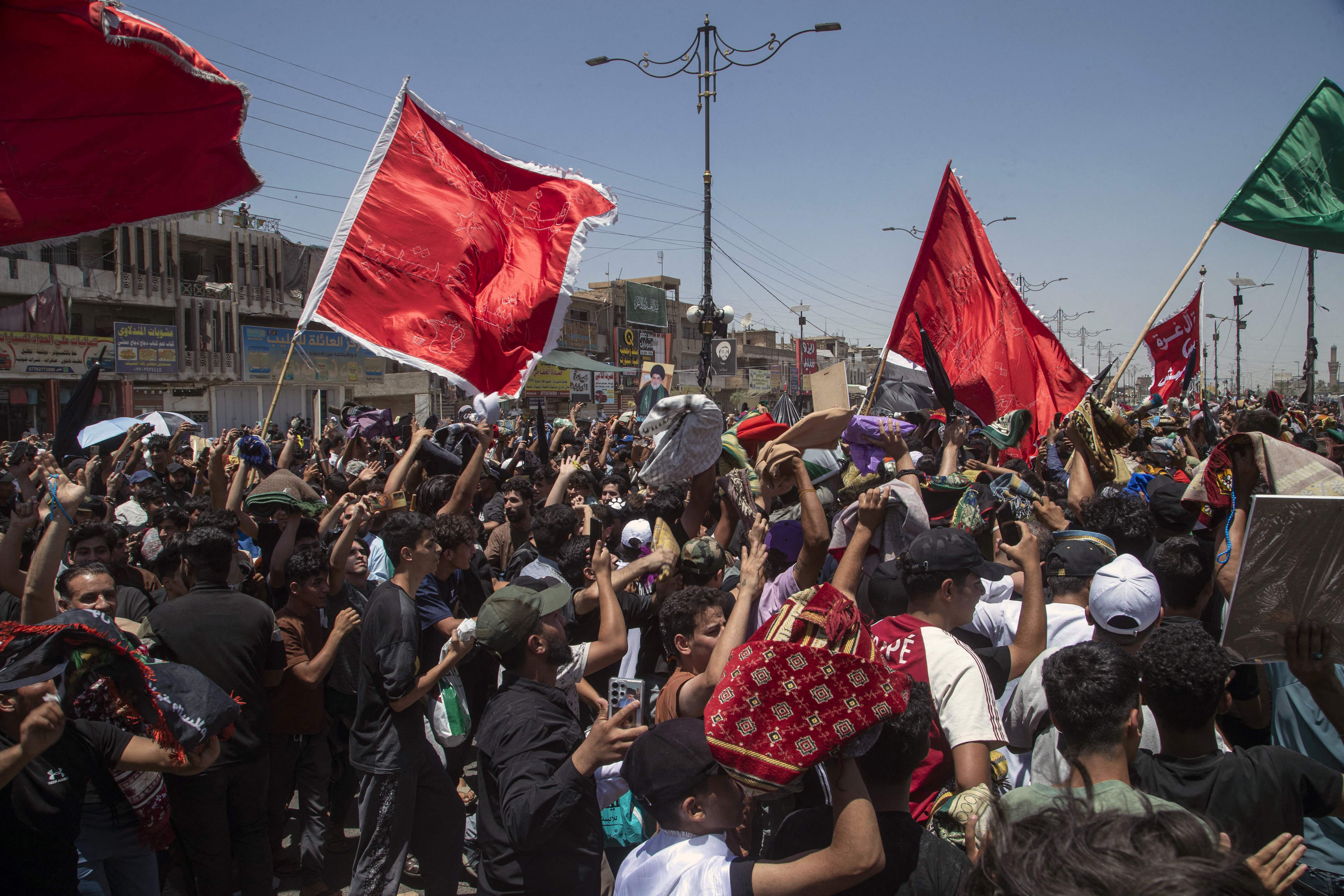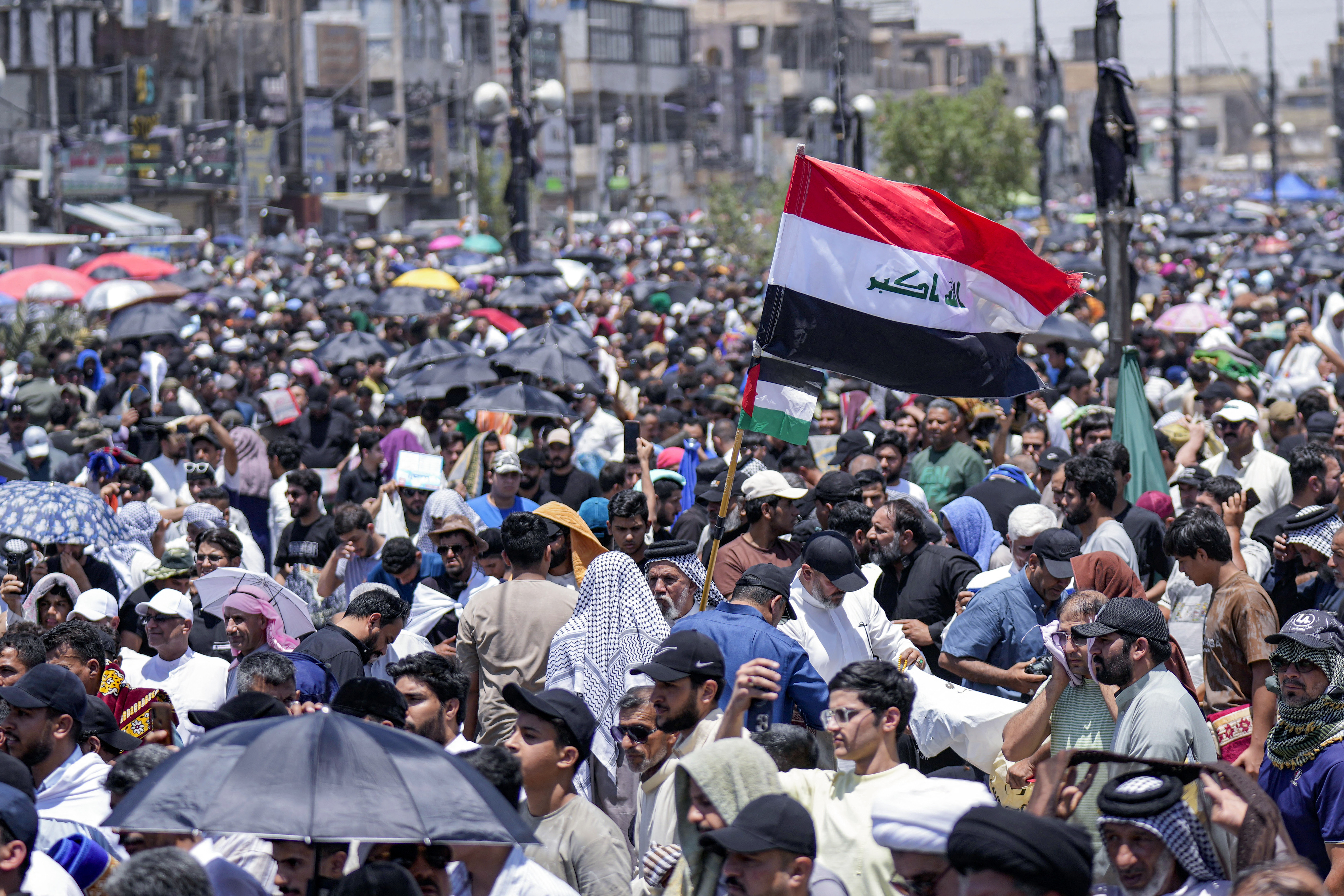 Manifestanţii s-au adunat la Bagdad pe un bulevard larg, în cartierul sărac Madinet Sadr, protejându-se de un soare arăztor cu o mare de umbrele.