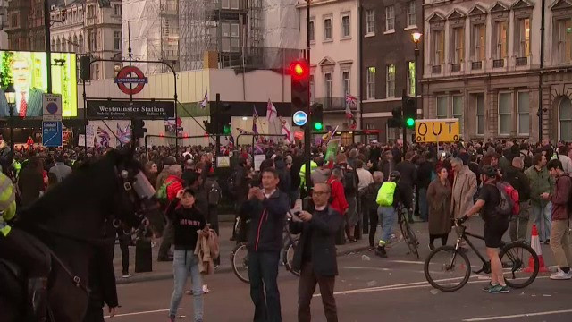 Mii de manifestanţi s-au adunat vineri în faţa sediului Parlamentului britanic, pentru a cere implementarea Brexitului în această zi în care Regatul Unit urma să părăsească Uniunea Europeană (UE), relatează AFP.