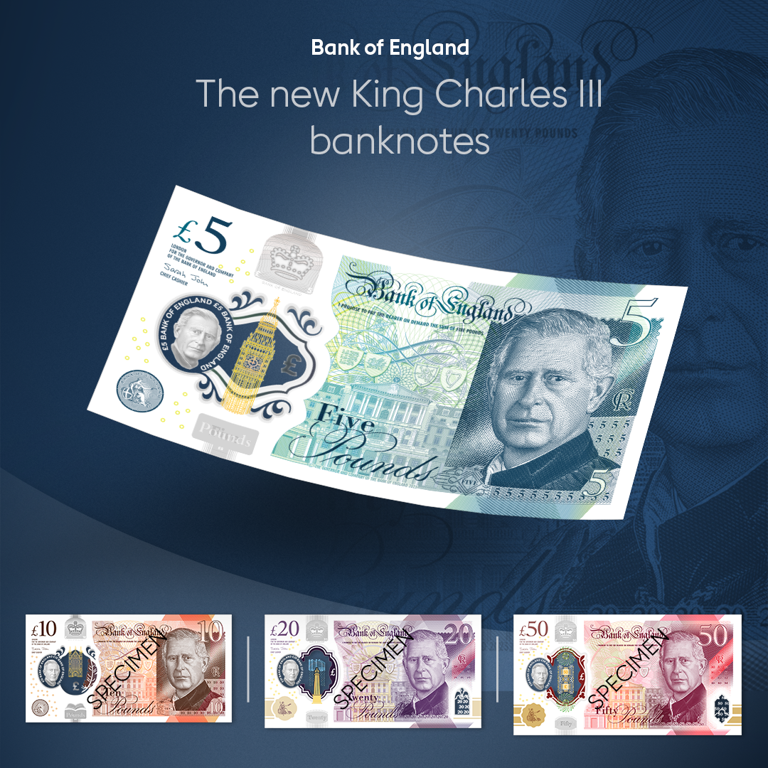 Astfel, portretul regelui va apărea pe modelele existente ale tuturor celor patru bancnote din polimer (5 GBP, 10 GBP, 20 GBP și 50 GBP), fără alte modificări ale modelelor existente.