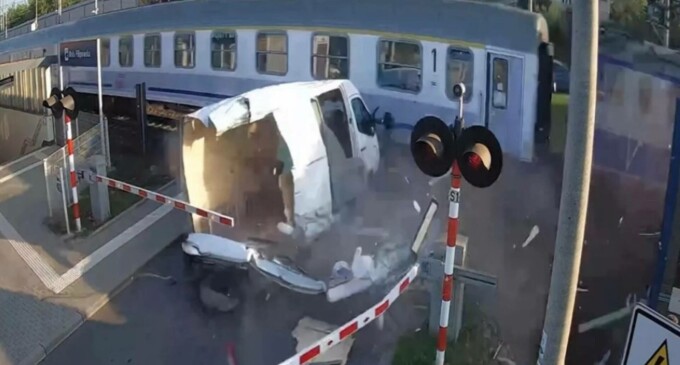Un șofer din Polonia a scăpat ca prin minune după ce dubița sa a fost lovită în plin de un tren, pe o trecere la nivel cu calea ferată. Vehiculul a rămas blocat între barierele coborâte, iar impactul a fost surprins de camerele de supraveghere.