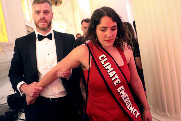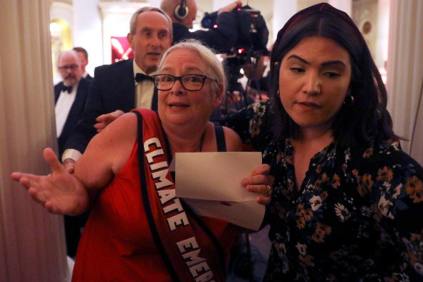 O militantă ce purta o rochie de seară, peste care a pus o centură cu mesajul ''Urgenţă climatică'', a început să se plimbe în jurul meselor. Mark Field s-a ridicat brusc când ea a trecut pe lângă el şi a imobilizat-o brutal lipind-o de o coloană de piatră, apoi a apucat-o de ceafă şi a dat-o afară din încăpere, conform înregistrării video de la eveniment.