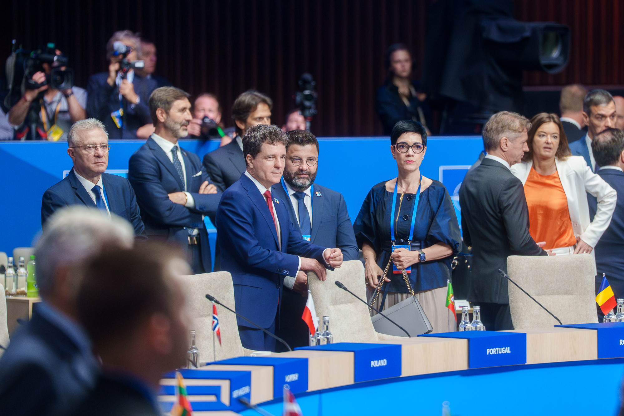 În fotografia realizată cu toţi invitaţii pe treptele Palatul Huis ten Bosch din Haga, reşedinţa oficială a regelui Willem-Alexander şi a reginei Maxima a Olandei, preşedintele României a stat în rândul al doilea, avându-l în stânga pe secretarul general al NATO, Mark Rutte, iar în faţa sa au stat preşedintele SUA, Donald Trump, şi gazdele regale, care au ocupat rândul din faţă.
