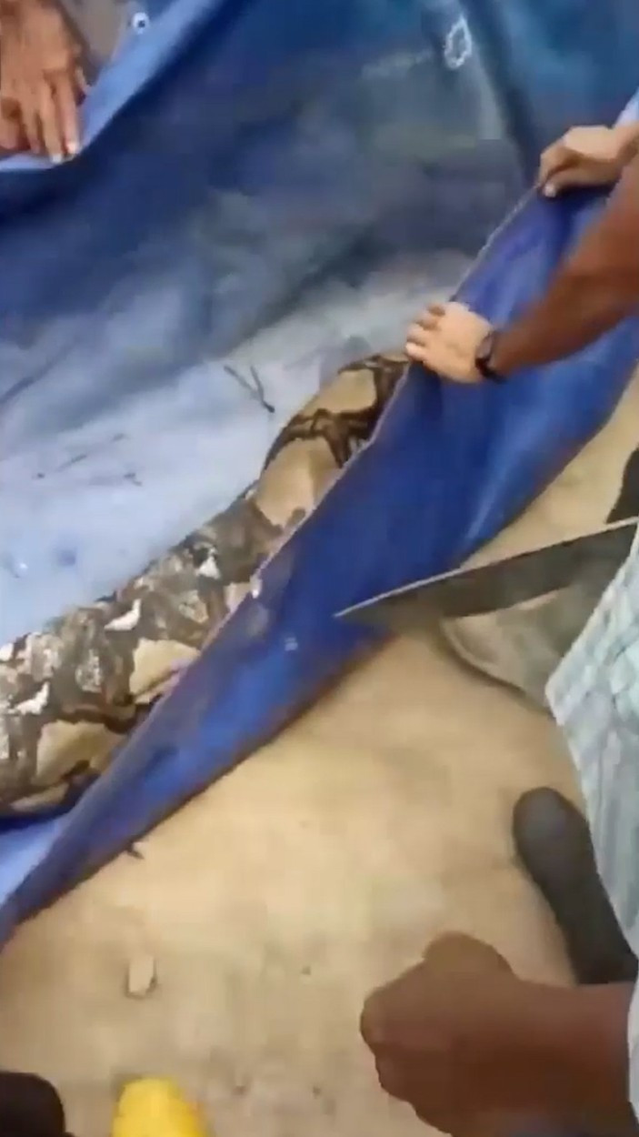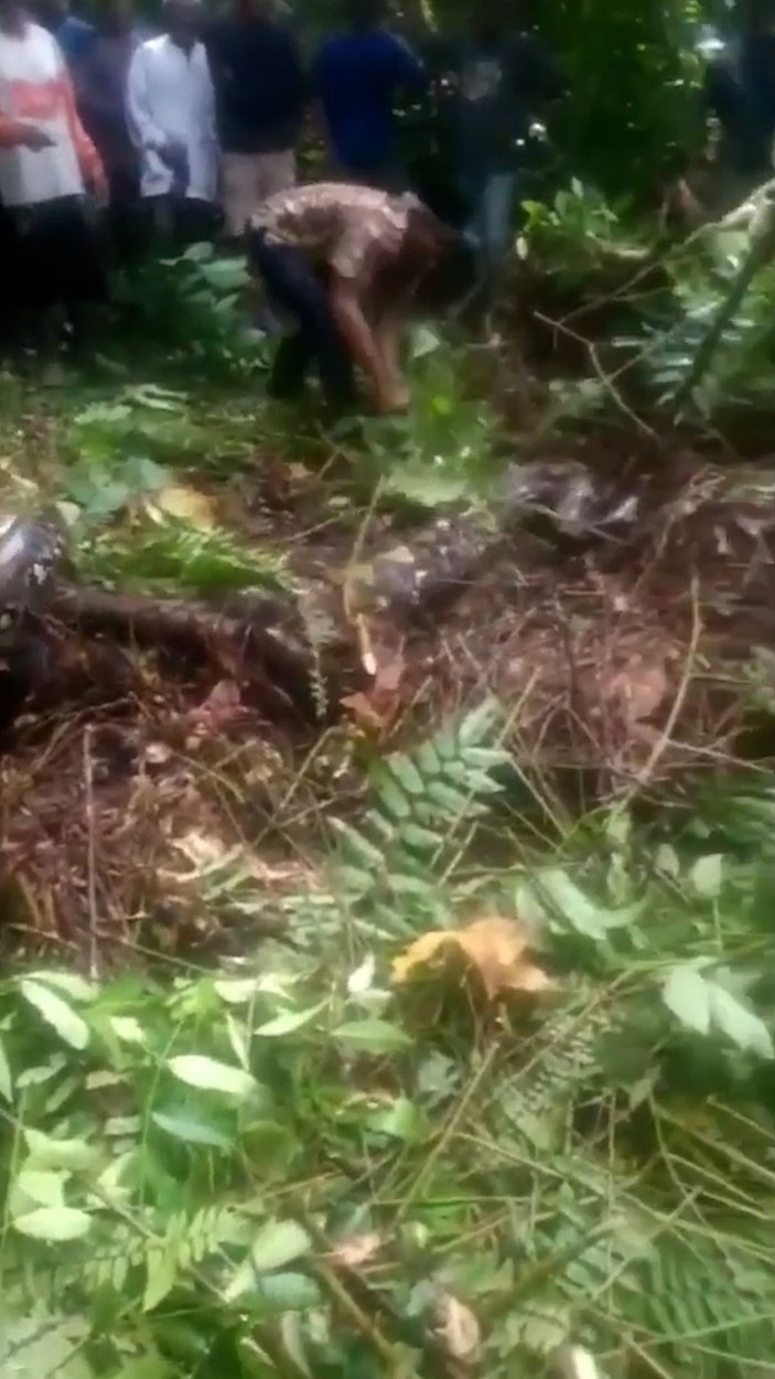Un voluntar a folosit cu grijă o ramură de copac pentru a-i fixa capul pitonului în jos, în timp ce alții au început să-l lovească deasupra zonei umflate.