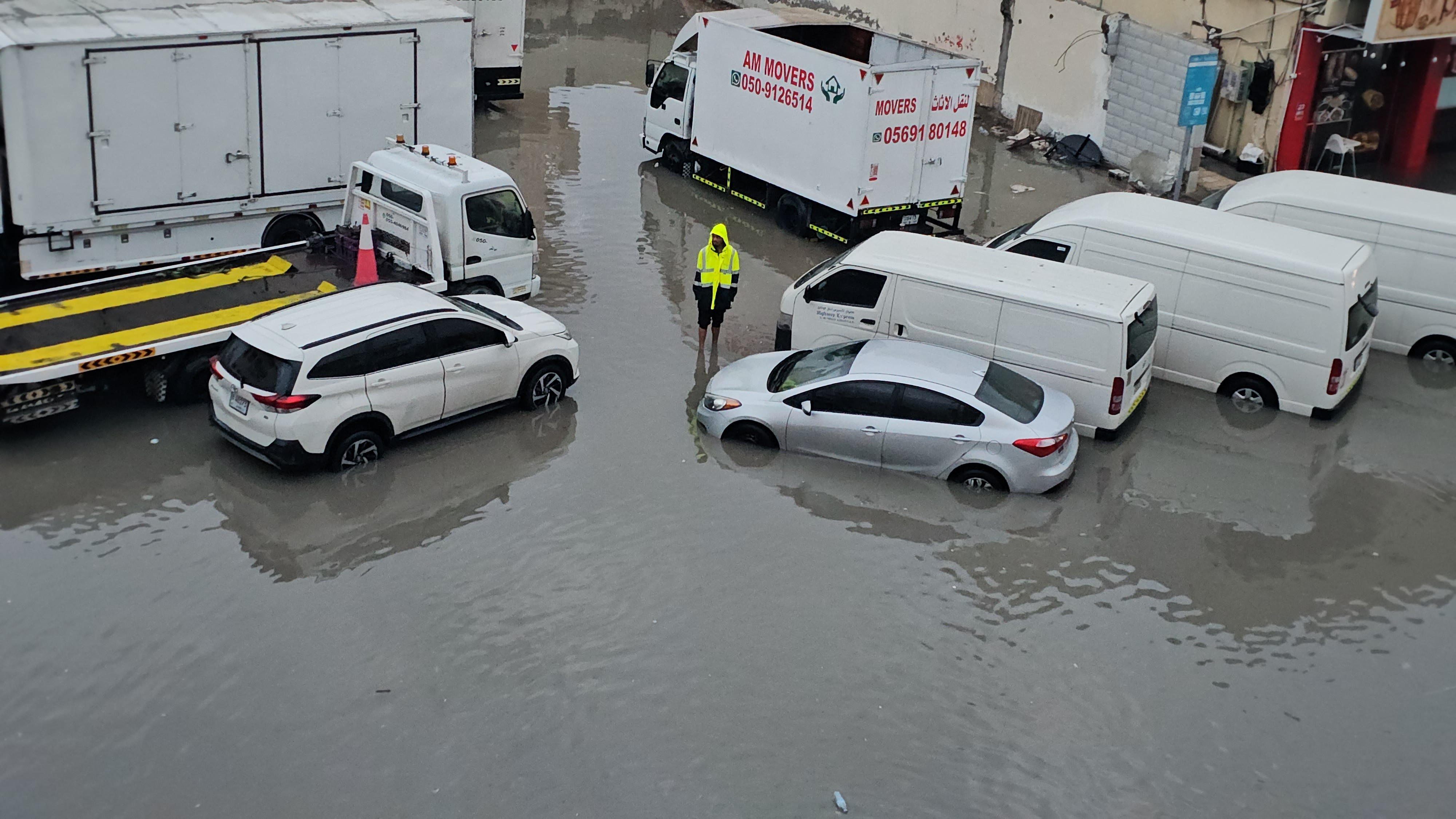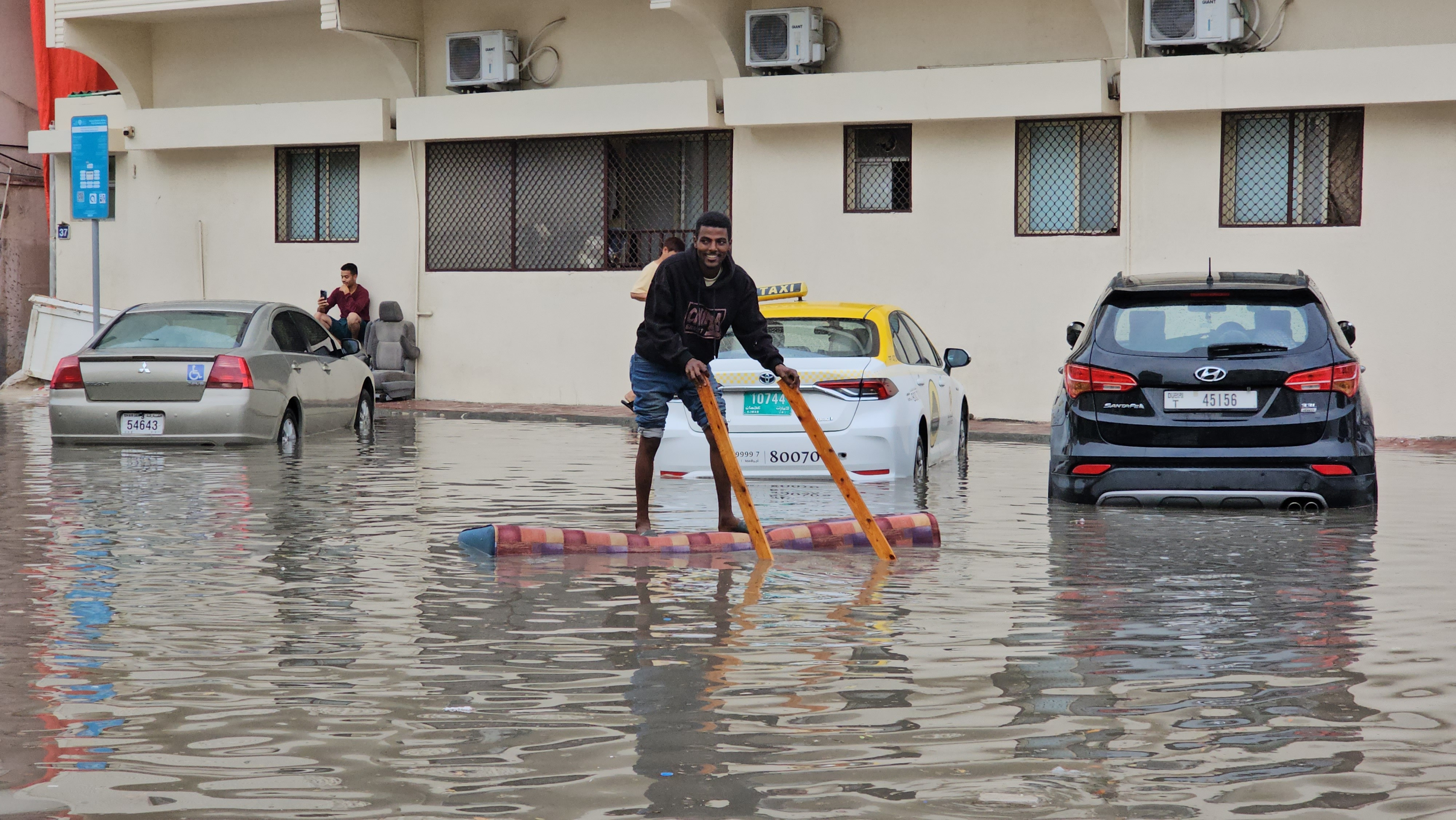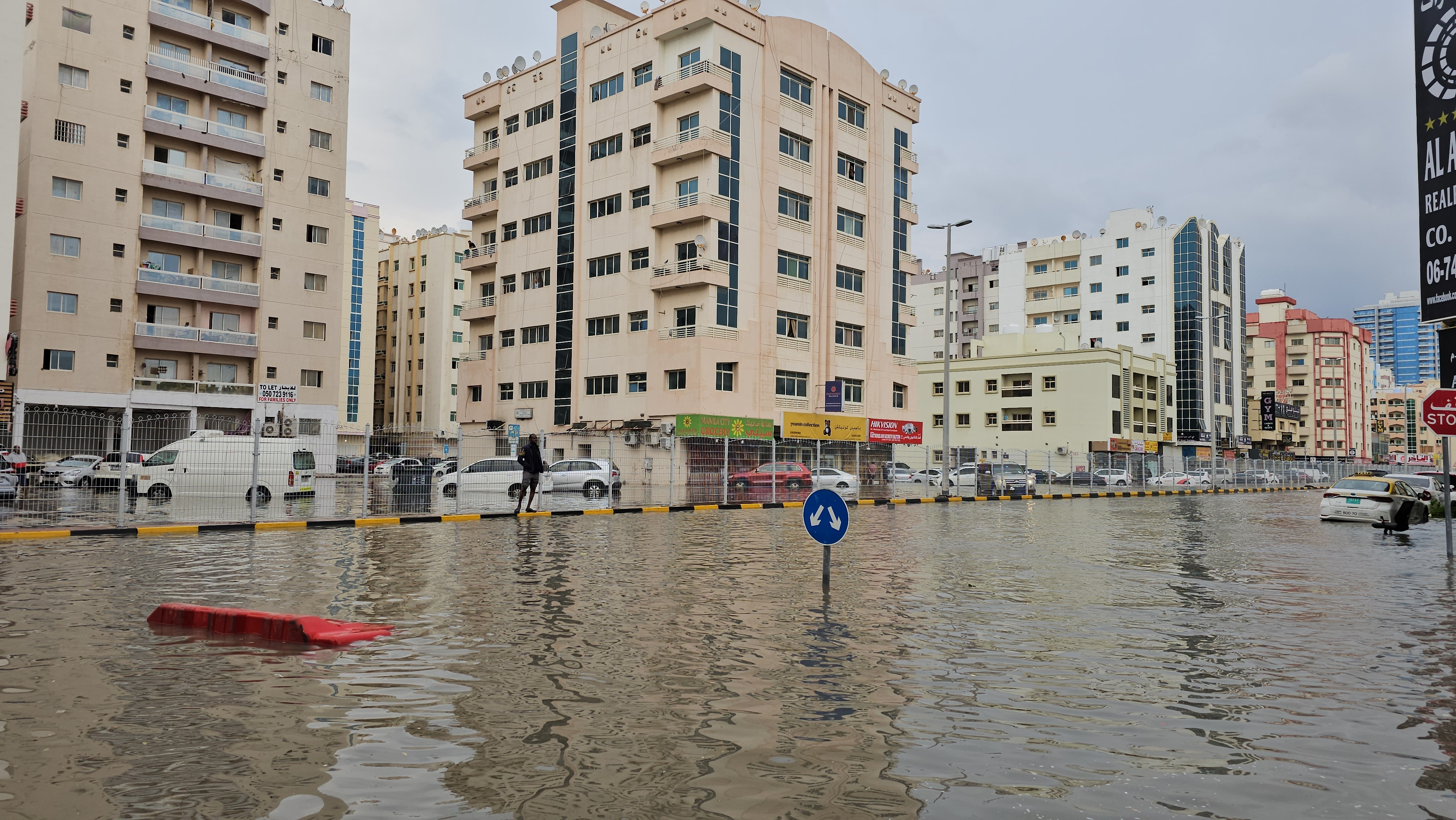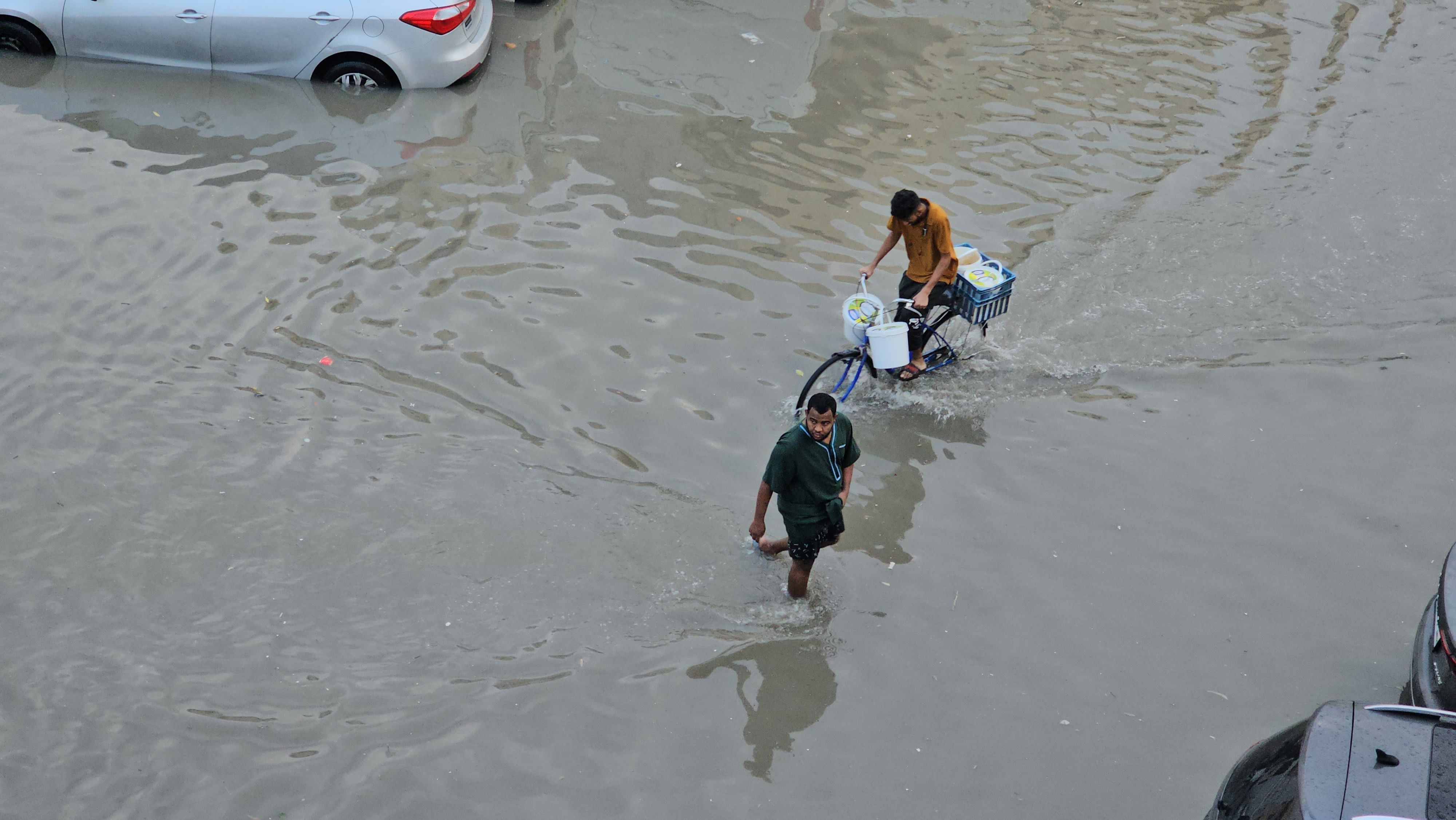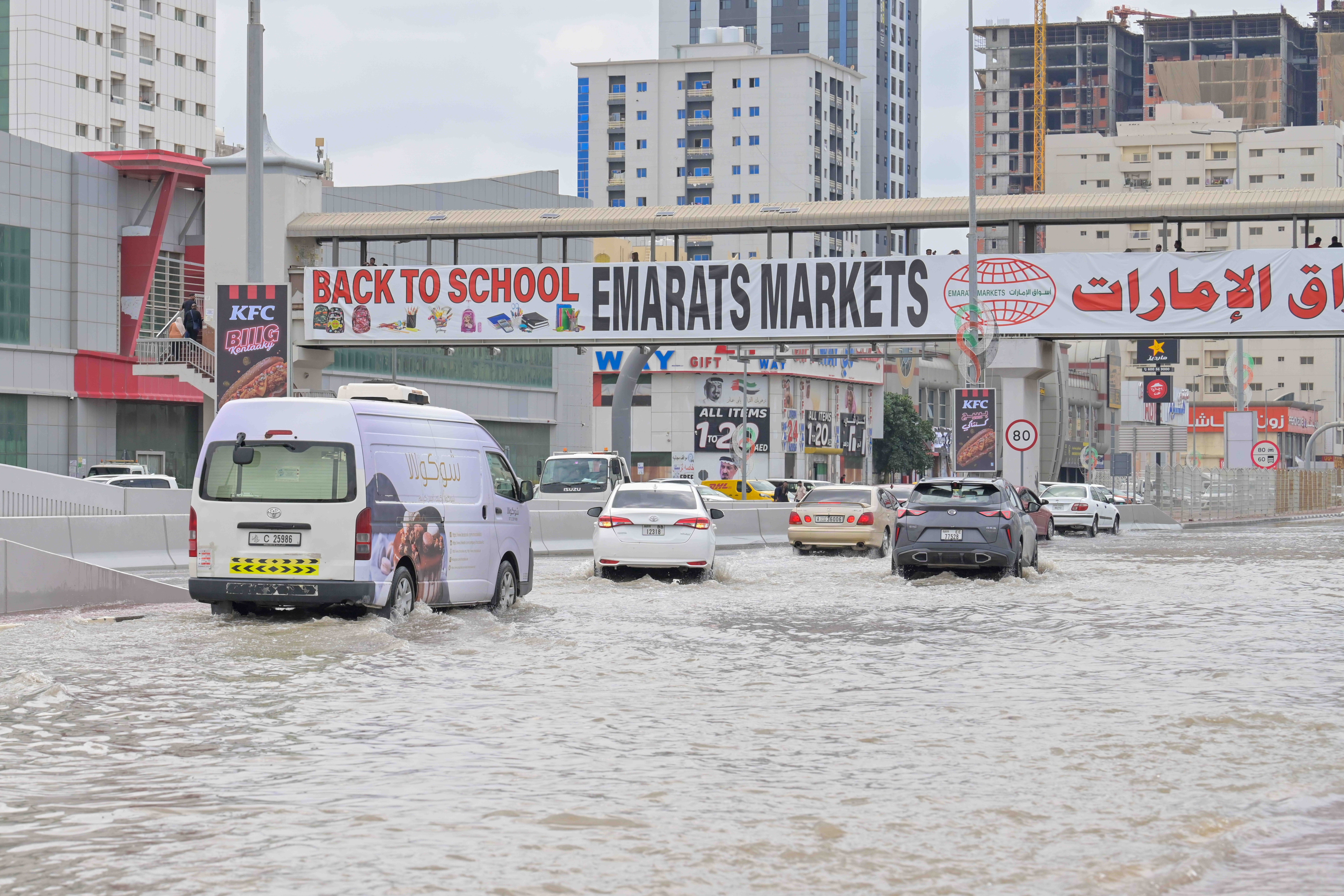 Vineri, una dintre străzile principale din Sharjah era complet inundată şi era traversată de către persoane desculţe, cu pantalonii suflecaţi. Un pic mai departe, o bicicletă se afla în apă până aproape peste roţi.