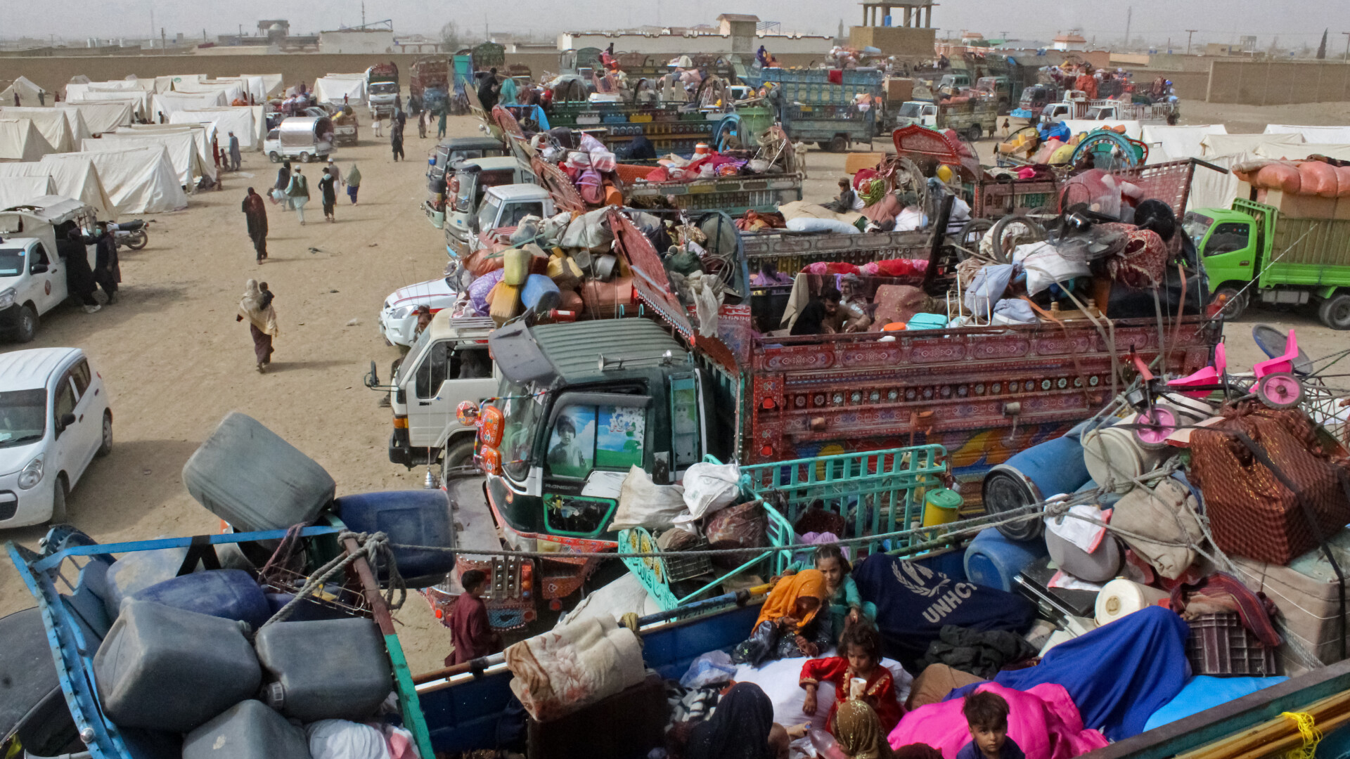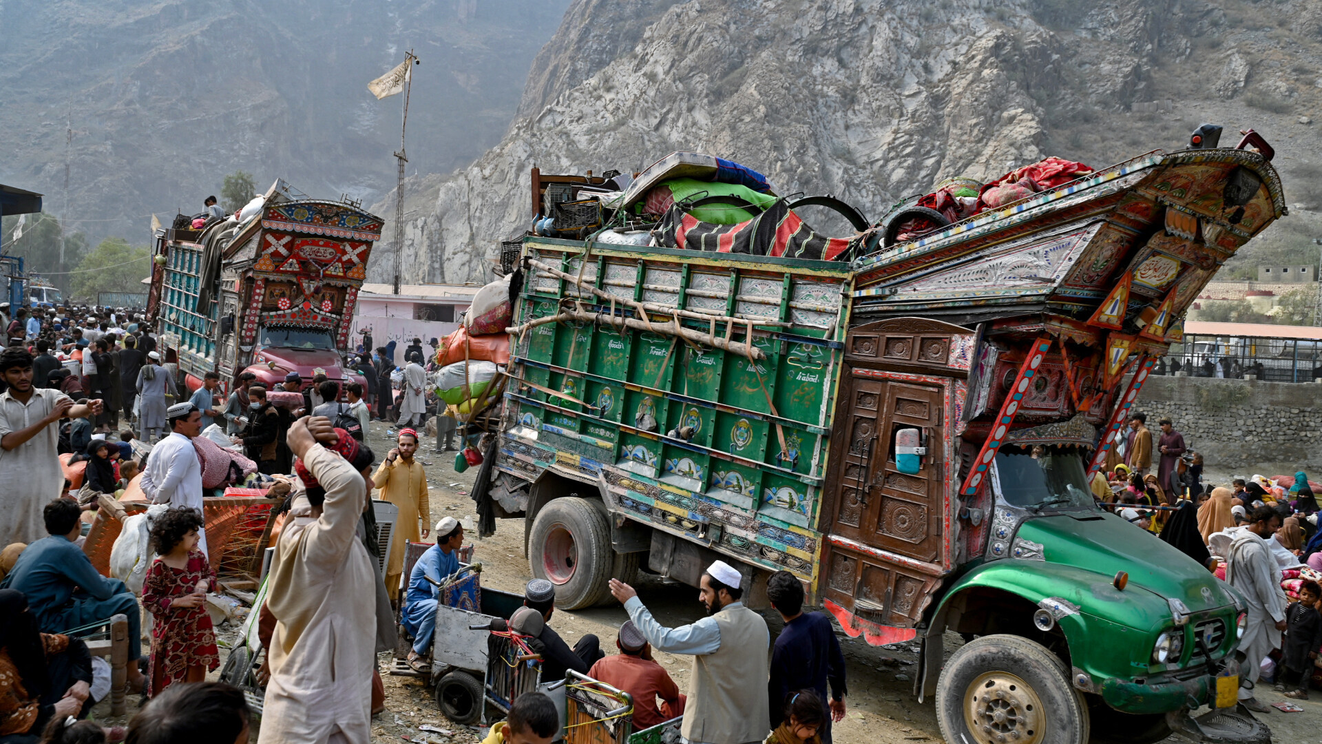 La graniță, cetățeni afgani de toate vârstele stau așezați pe grămezi de mobilă, lemne de foc, aragazuri și aparate de aer condiționat care se clatină precar, în timp ce vehiculele se strecoară prin trafic în drumul lor spre Afganistan.