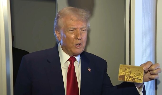 Donald Trump le-a arătat cu mândrie jurnaliştilor aflaţi la bordul aeronavei sale Air Force One un „card de aur”, în valoare de 5 milioane de dolari, care are imaginea sa pe el şi care poate fi obţinut de străinii bogaţi, dacă vor să fie primiţi în SUA.