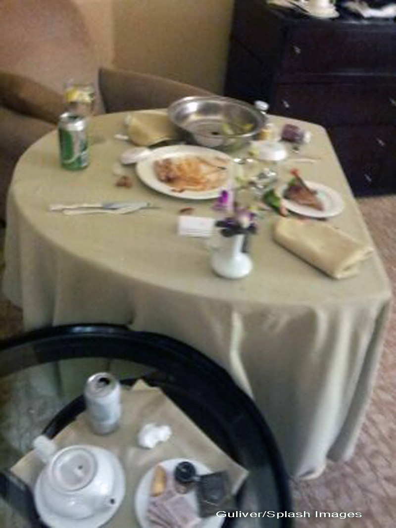 In imaginea care reda camera, fotografii au surprins masa pe care se afla o cutie de bere si un pahar de sampanie. Se pare ca Whitney comandase un hamburger, o portie de cartofi prajiti si un sandwich cu carne de curcan.