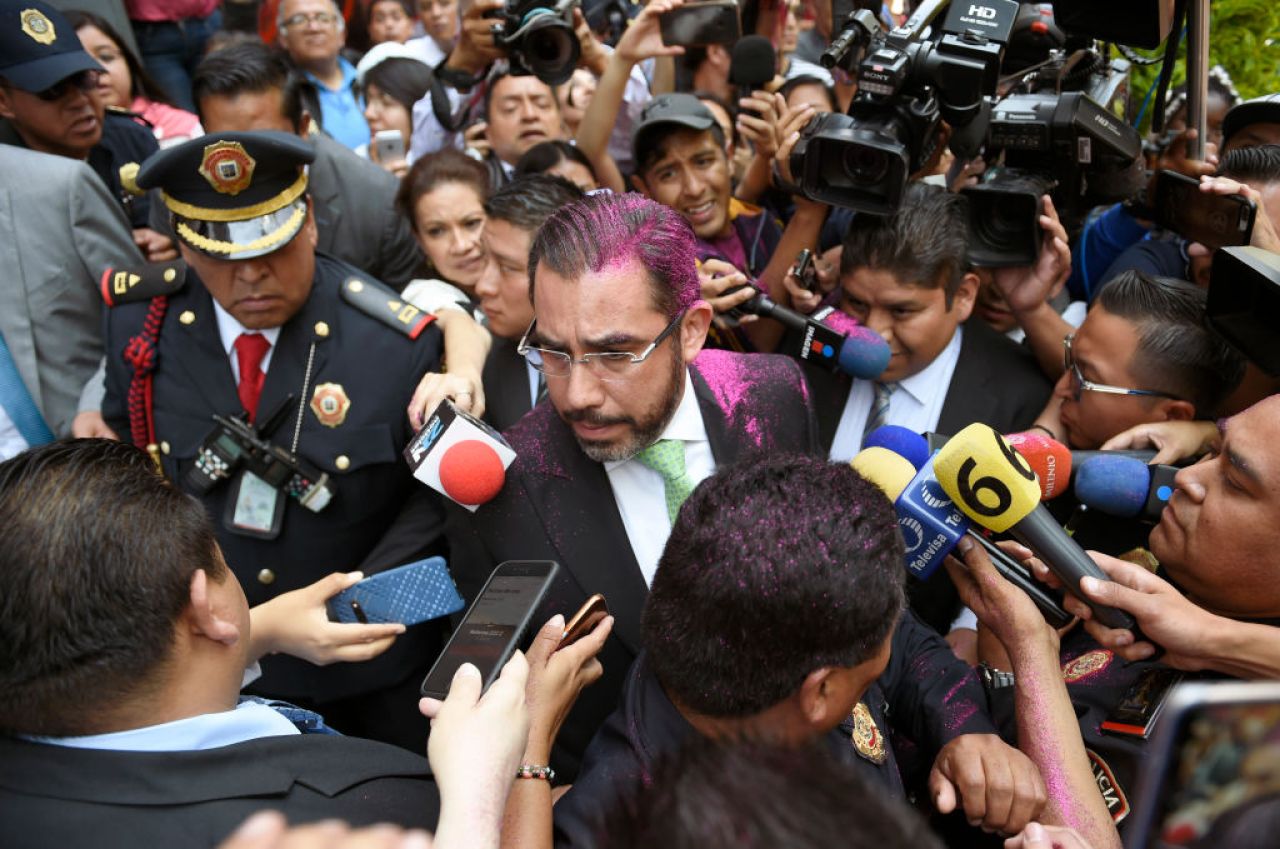 În timp ce încerca să asigure manifestanții că ambele cazuri vor fi tratate cu maximum de profesionalism, ministrul Securității, Jesús Orta Martínez, a fost acoperit de sclipici roz.