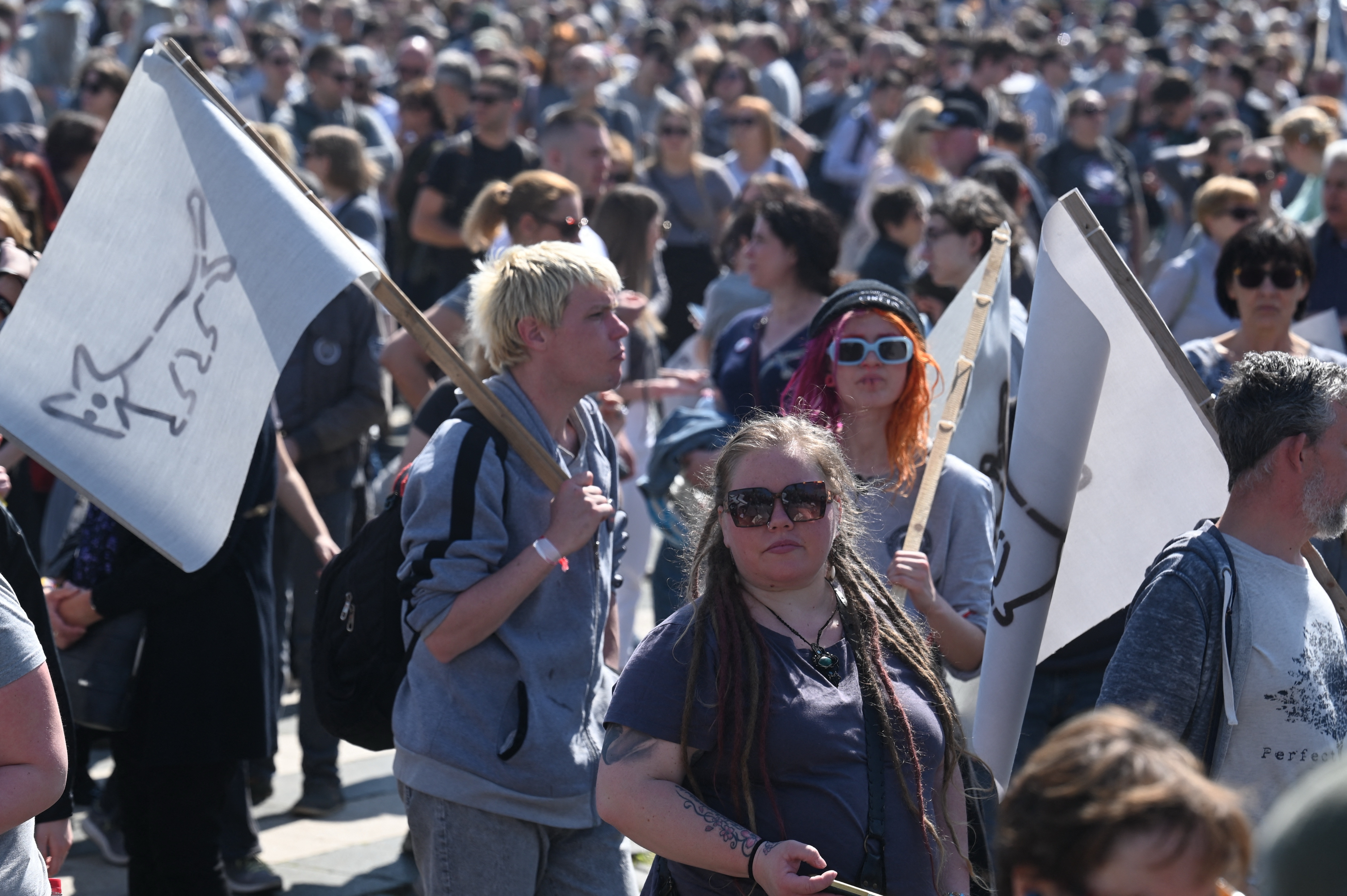 Câteva mii de maghiari au ironizat demersurile premierului de dreapta Viktor Orban de a interzice marşul anual Pride al grupurilor LGBTQ+, îmbrăcaţi în gri şi purtând bannere care denunţau ironic culorile şi diversitatea.