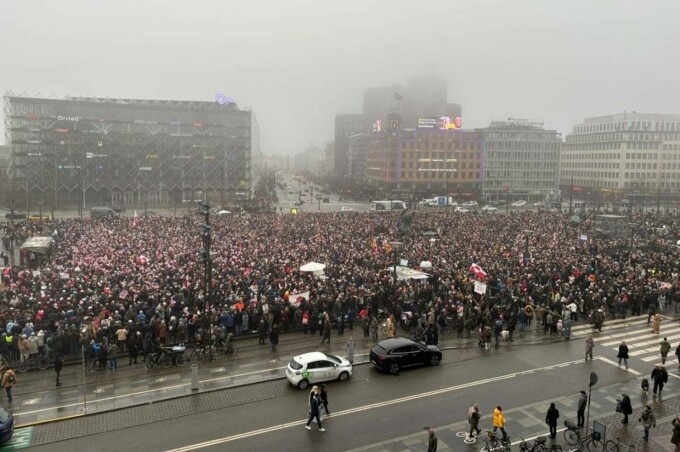 Manifestanţi purtând steaguri groenlandeze şi daneze au format o maree rouşu-albă, culorile steagurilor, în Piaţa Primăriei, sub un cer gri, învăluit în ceaţă.