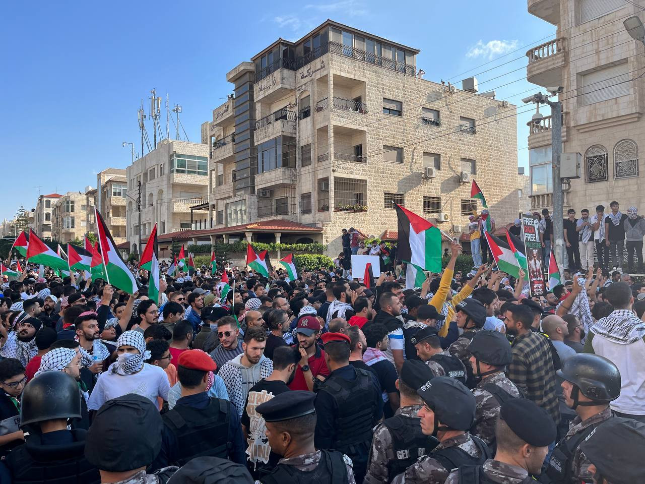 Forţele de securitate iordaniene au făcut eforturi pentru a dispersa o mulţime de mii de protestatari care încearcau să ia cu asalt ambasada israeliană din Amman, în semn de protest faţă de războiul din Gaza.