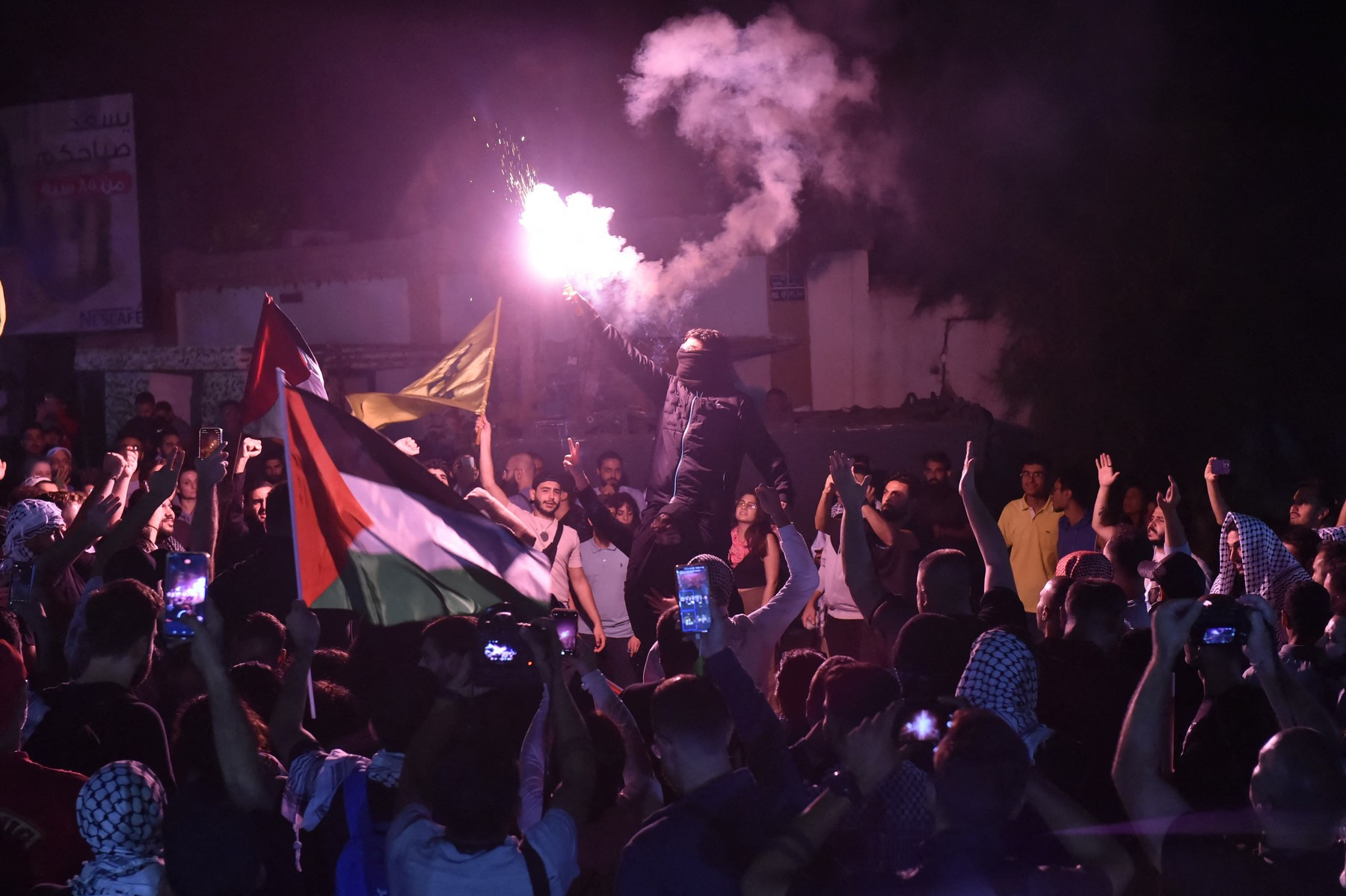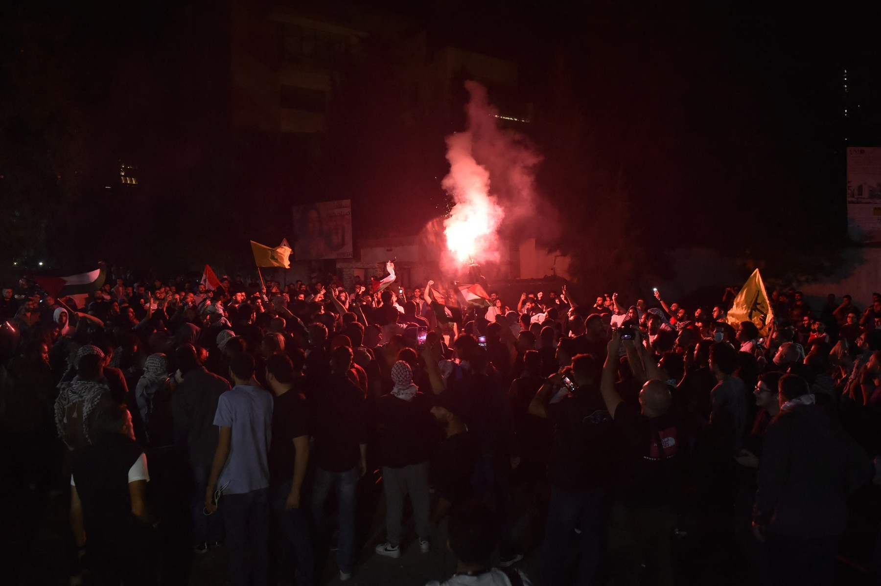 "إصرار المتظاهرين أمام السفارة الأميركية في عوكر على إيصال الصوت نصرة لـ #فلسطين رغم محاولات تفرقتهم بالقنابل المسيّلة للدموع".