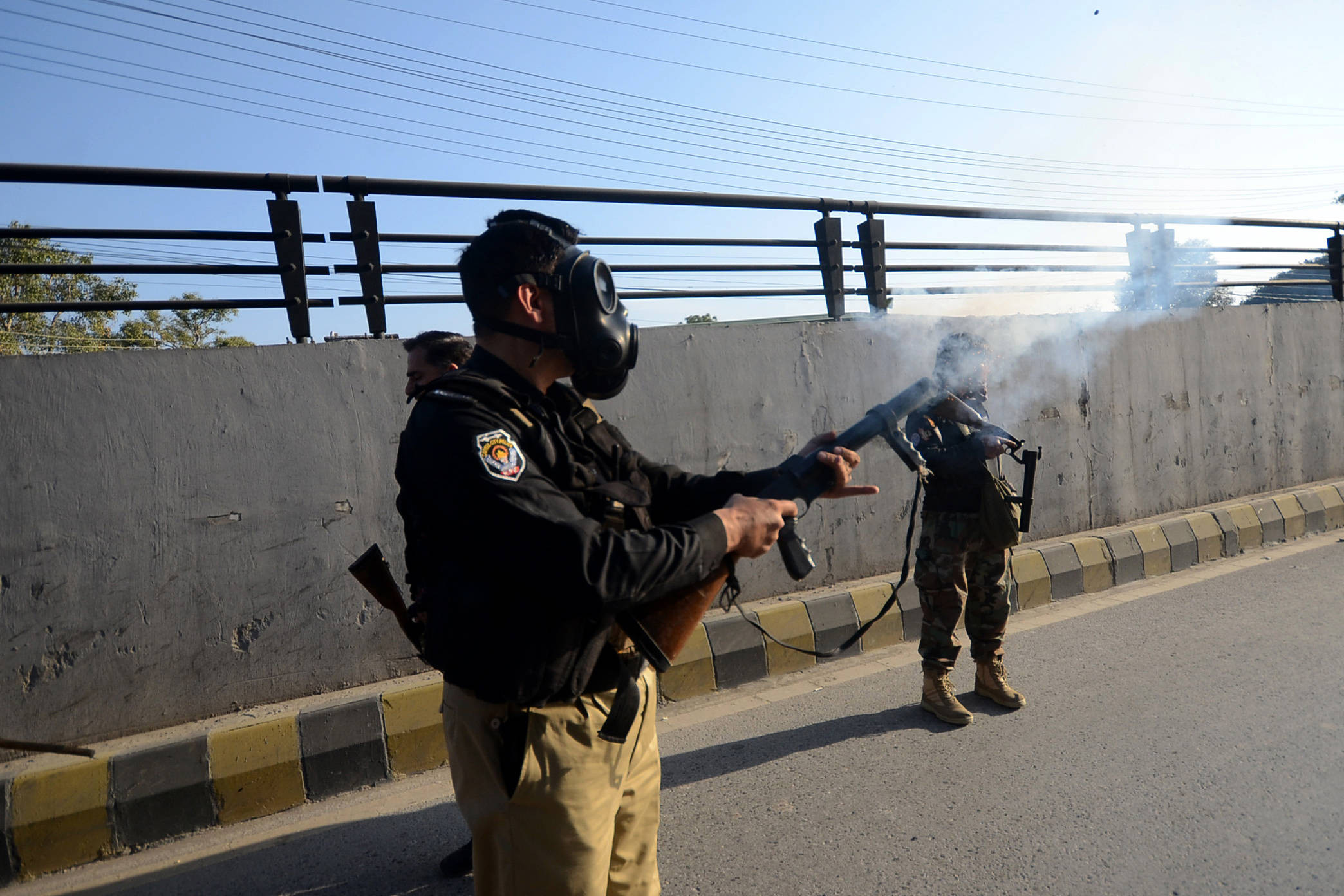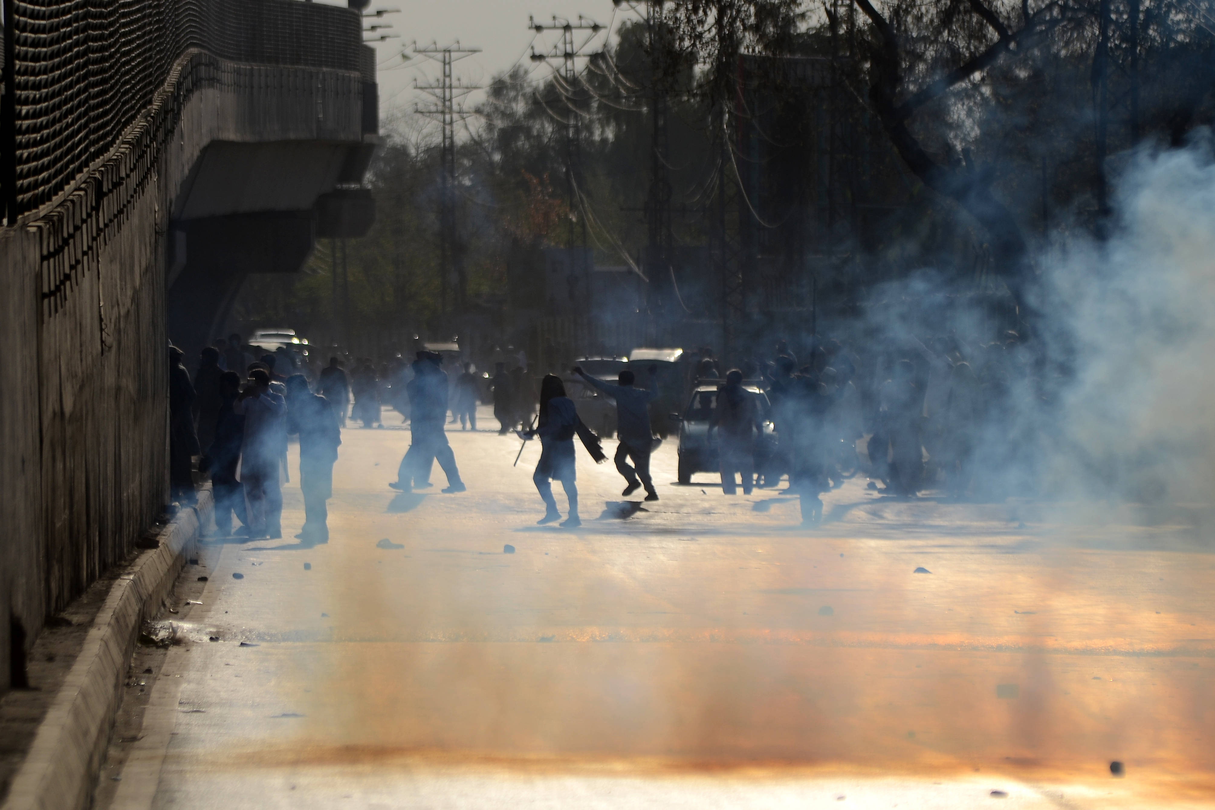 Jurnaliştii AFP au văzut poliţia trăgând gaze lacrimogene pentru a dispersa mulţimea din apropierea enclavei diplomatice unde se află ambasada SUA, duminică după-amiază.